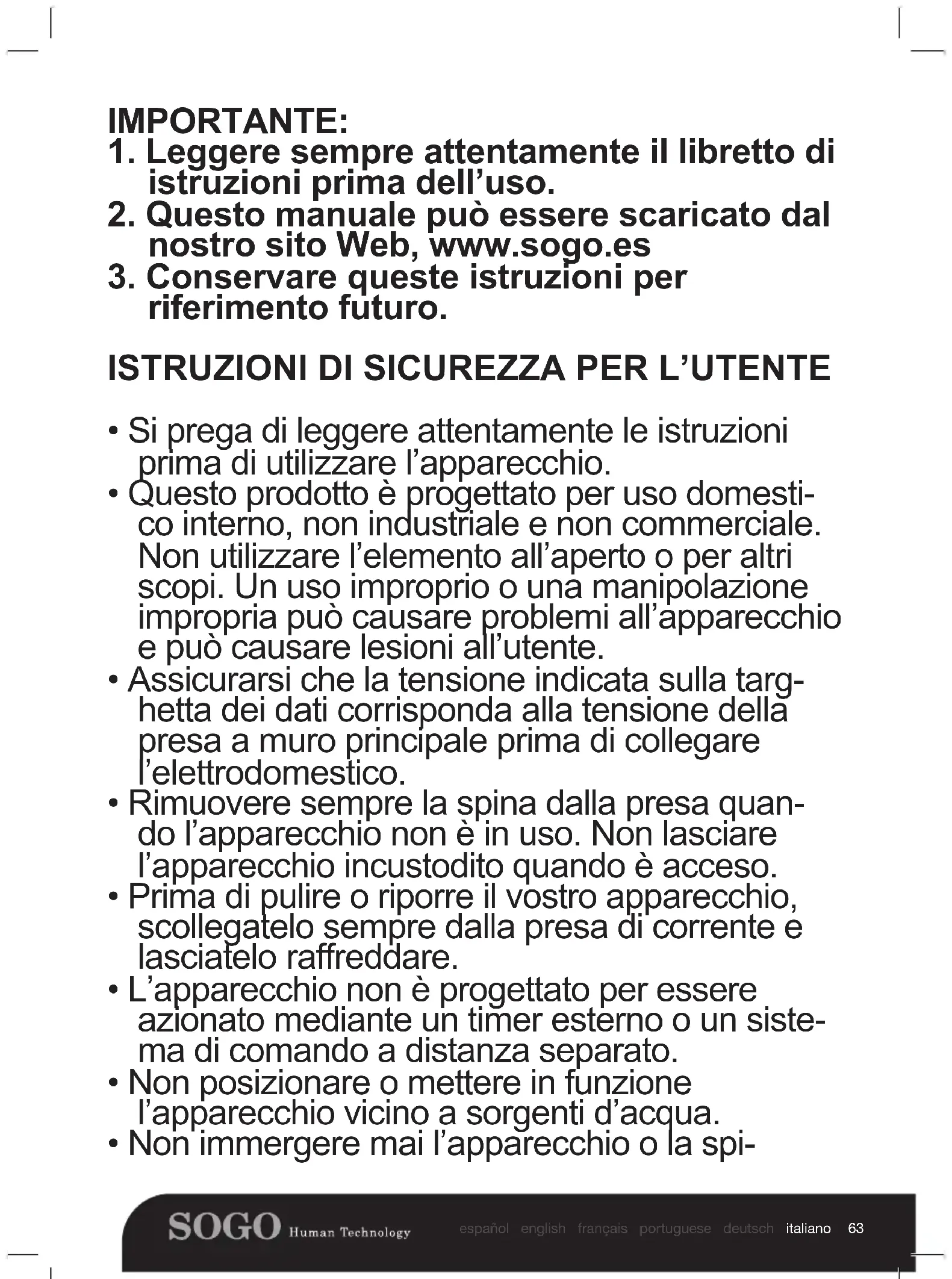 - Non utilizzare l’apparecchio per scopi diversi da quelli descritti in questo manuale.66 español english français portuguese deutsch italiano