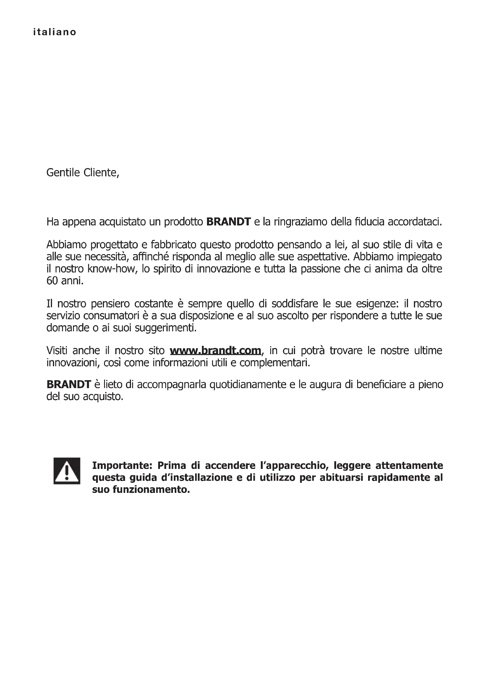 INTERVENTIES Eventuele interventies aan uw apparaat moeten worden uitgevoerd door een gekwalificeerde professionele technicus van het merk. Om bij het opbellen de verwerking van uw verzoek te vergemakkelijken, houdt de volledige referentie van uw toestel bij de hand (commerciële referentie, servicereferentie, serienummer). Deze informatie wordt weergegeven op het identificatieplaatje. ORIGINELE ONDERDELEN Eis bij een interventie het gebruik van exclusieve gecerticeerde originele reserveonderdelen. Milieubescherming Dit symbool geeft aan dat dit product niet mag worden behandeld als huishoudelijk afval. Uw apparaat bevat eveneens tal van recycleerbare materialen. Daarom is het voorzien van dit symbool dat aangeeft dat de gebruikte apparaten van ander afval dient te worden gescheiden. Informeer bij uw gemeente of bij uw verkoper naar de dichtstbijzijnde inzamelplaats voor uw oude apparaten. De recyclage van de apparaten die door uw fabrikant wordt georganiseerd, wordt op deze manier onder de beste omstandigheden uitgevoerd, overeenkomstig de Europese richtlijn betreffende elektrisch en elektronisch afval. Bepaalde verpakkingsmaterialen van dit apparaat zijn recyclebaar. Doe mee aan de recycling en draag bij aan de bescherming van het milieu door dit materiaal in de hiervoor bestemde gemeentecontainers te deponeren. Wij danken u voor uw bijdrage aan de bescherming van het milieu.italiano Gentile Cliente, Ha appena acquistato un prodotto BRANDT e la ringraziamo della ducia accordataci. Abbiamo progettato e fabbricato questo prodotto pensando a lei, al suo stile di vita e alle sue necessità, afnché risponda al meglio alle sue aspettative. Abbiamo impiegato il nostro know-how, lo spirito di innovazione e tutta la passione che ci anima da oltre 60 anni. Il nostro pensiero costante è sempre quello di soddisfare le sue esigenze: il nostro servizio consumatori è a sua disposizione e al suo ascolto per rispondere a tutte le sue domande o ai suoi suggerimenti. Visiti anche il nostro sito www.brandt.com, in cui potrà trovare le nostre ultime innovazioni, così come informazioni utili e complementari. BRANDT è lieto di accompagnarla quotidianamente e le augura di beneciare a pieno del suo acquisto. Importante: Prima di accendere l’apparecchio, leggere attentamente questa guida d’installazione e di utilizzo per abituarsi rapidamente al suo funzionamento.italiano L’apparecchio può essere usato da bambini con età superiore agli 8 anni e da persone con ridotte capacità siche, sensoriali e mentali o prive d’esperienza e di competenza nel caso siano state correttamente formate o istruite sull’utilizzo in sicurezza dell’apparecchio e ne siano stati compresi i rischi potenziali. I bambini non dovrebbero giocare con l’apparecchio. La pulizia e la cura dell’apparecchio non devono essere effettuati da bambini senza la sorveglianza di un adulto. I bambini no a 8 anni devono essere tenuti a distanza a meno che non siano costantemente sorvegliati. L’apparecchio e le sue parti accessibili si scaldano durante l’utilizzo. Devono essere prese precauzioni al ne di evitare di toccare gli elementi riscaldanti. Gli oggetti metallici quali coltelli, forchette, cucchiai e coperchi non devono essere posti sulla superficie poiché possono scaldarsi. Il piano è dotato di funzione sicurezza bambini che ne blocca l’utilizzo quando è spento o in fase di cottura (vedere capitolo: utilizzo della funzione sicurezza bambini). Questo apparecchio è conforme alle Direttive e ai regolamenti europei ai quali è soggetto. Afnché non ci siano interferenze tra il piano cottura e un pacemaker è necessario che quest’ultimo sia progettato e regolato in conformità con la regolamentazione che lo riguarda. È necessario informarsi presso il fabbricante del pacemaker o il medico curante. Una cottura con olio o con grasso effettuata sul piano senza supervisione può essere pericolosa e provocare un incendio. Non cercare MAI di spegnere un fuoco con acqua, ma interrompere l’alimentazione dell’apparecchio e poi coprire la amma con un coperchio o una coperta antiamma. ATTENZIONE: la cottura deve essere supervisionata. Una cottura breve necessita di una supervisione continua. Rischio d’incendio: non accumulare oggetti sulle superci di cottura. Se la superficie presenta incrinature, spegnere l’appa- recchio per evitare il rischio di