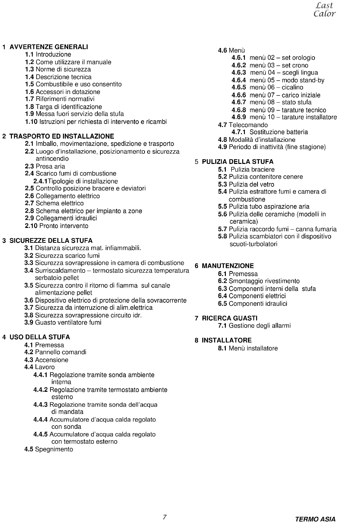 - Leggere il manuale d’uso e manutenzione prima di installare , accedere e manutentore la stufa . - Eseguire l’installazione,il collegamento elettrico,il collaudo e la manutenzione da un tecnico qualificato e/o autorizzato. - Collegare la stufa ad una canna fumaria a Norma tramite un terminale ispezionabile; Il collegamento di più apparecchi può avvenire solo se viene contemplato dalle Norme locali e concesso dall’Organismo di controllo della canna fumaria. - Collegare la stufa all’aspirazione tramite un tubo o presa d’aria dall’esterno . - Collegare la stufa ad una presa elettrica a Norma tensione 230 V-50 Hz . - Nel modello TERMO collegare l’apparecchio all’impianto di riscaldamento ; esso non può in nessun caso essere usato senza l’allacciamento idraulico e senza la carica dell’acqua interna alla termocamera . - Verificare che l’impianto elettrico e le prese abbiano la capacità di sopportare l’assorbimento massimo dell’apparecchio riportata sull’etichetta e sul presente manuale. - Prima di ogni manutenzione staccare la spina elettrica dalla stufa ed operare solo con stufa fredda. - Non impiegare liquidi o sostanze infiammabili per accendere la stufa o per ravvivare la fiamma: a stufa accesa l’accensione del pellet è automatica. - La stufa a pellet deve essere alimentata solo ed esclusivamente con pellet di legna aventi le caratteristiche descritte nel presente manuale. - La stufa non deve essere usato come inceneritore. - Non chiudere in alcun caso le aperture di ingresso dell’aria comburente e uscita fumi . - E’ vietato manipolare sostanze facilmente infiammabili o esplosive nelle vicinanze della stufa durante il suo funzionamento. - Non rimuovere la griglia di protezione del serbatoio pellet. - E’ vietato il funzionamento della stufa con la porta fuoco aperta e/o vetro rovinato o rotto. - Durante il funzionamento il forte calore sviluppato dalla combustione del pellet surriscalda le superfici esterne della stufa in particolare porta fuoco, maniglia e tubo scarico fumi . Evitare quindi di entrare in contatto con tali parti senza opportune protezioni. - Tenere ad opportuna distanza di sicurezza oggetti non resistenti al calore e/o infiammabili . - Pulire regolarmente il braciere ad ogni accensione o ricarica pellet. - Evitare la formazione di fumo ed incombusti in fase di accensione e/o nel normale funzionamento, l’eccessivo accumulo di pellet incombusto nel braciere deve essere rimosso prima di procedere con una nuova accensione . - Pulire regolarmente il condotto e deflettori fumi all’interno della camera di combustione da personale qualificato . - Avvertire bambini e ospiti dei pericoli sopra descritti. - L'apparecchio può essere utilizzato da bambini di età non inferiore a 8 anni e da persone con ridotte capacità fisiche, sensoriali o mentali, o prive di esperienza o della necessaria conoscenza, purché sotto sorveglianza oppure dopo che le stesse abbiano ricevuto istruzioni relative all'uso sicuro dell'apparecchio e alla comprensione dei pericoli ad esso inerenti - In caso di anomalie di funzionamento, la stufa può essere riaccesa solo dopo avere ripristinato la causa del problema. - Qualsiasi manomissione e/o sostituzione non autorizzata di particolari non originali della stufa può causare pericolo per l’incolumità dell’utente e solleva il costruttore da ogni responsabilità civile e penale. - Utilizzare solo ricambi originali consigliati dal produttore. La ditta produttrice non è responsabile di inconvenienti, rotture o incidenti dovuti al mancato rispetto o alla mancata applicazione delle indicazioni soprascritte e contenute nel manuale.TERMO ASIA