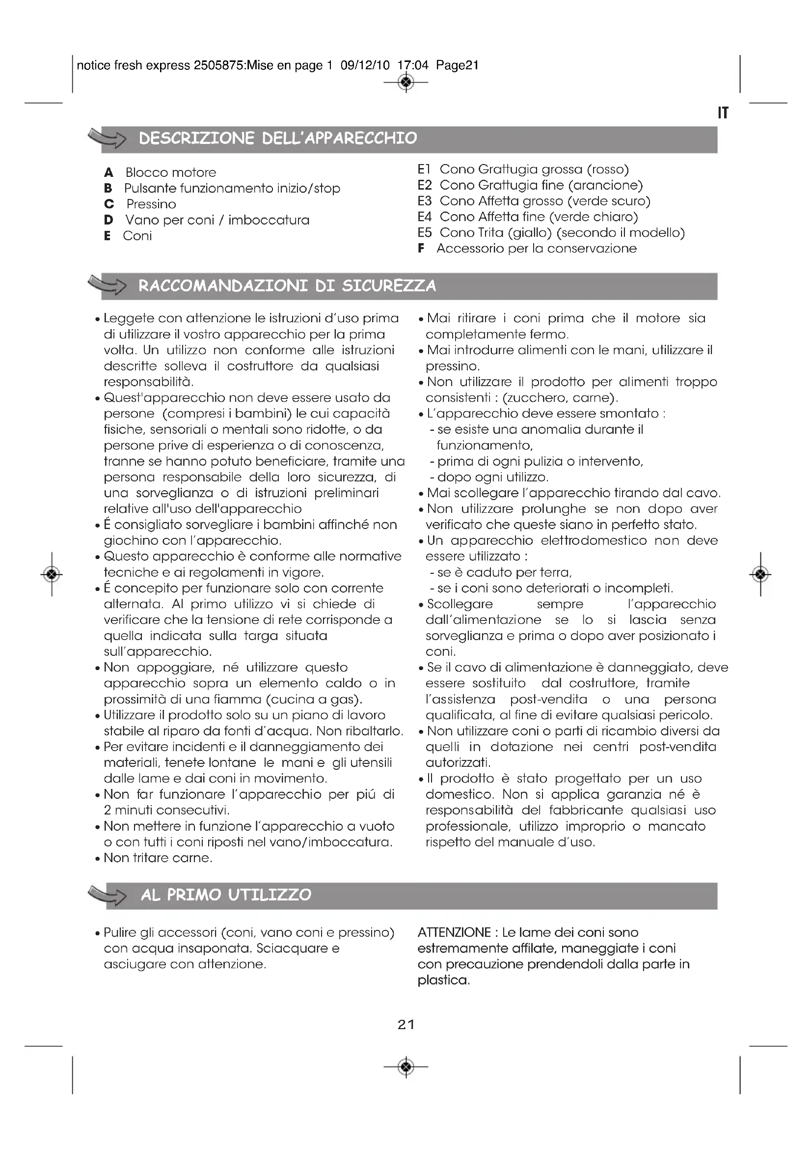 Il vostro apparecchio è stato progettato per funzionare per lunghi anni. Tuttavia, al momento di smaltirlo, non buttatelo nei rifiuti o una discarica ma consegnatelo in un punto di raccolta di rifiuti speciali organizzato dal vostro comune (o presso un centro discarica autorizzata se necessario). Salvaguardiamo l’ambiente ! Il vostro apparecchio contiene numerosi materiali valorizzabili o riciclabili Consegnatelo in un centro adatto allo smaltimento di questo tipo di rifiuti. notice fresh express 2505875:Mise en page 1 09/12/10 17:04 Page2425 A Bloco do motor B Botão ligar / desligar C Calcador D Compartimento para os cones / chaminé E Cones