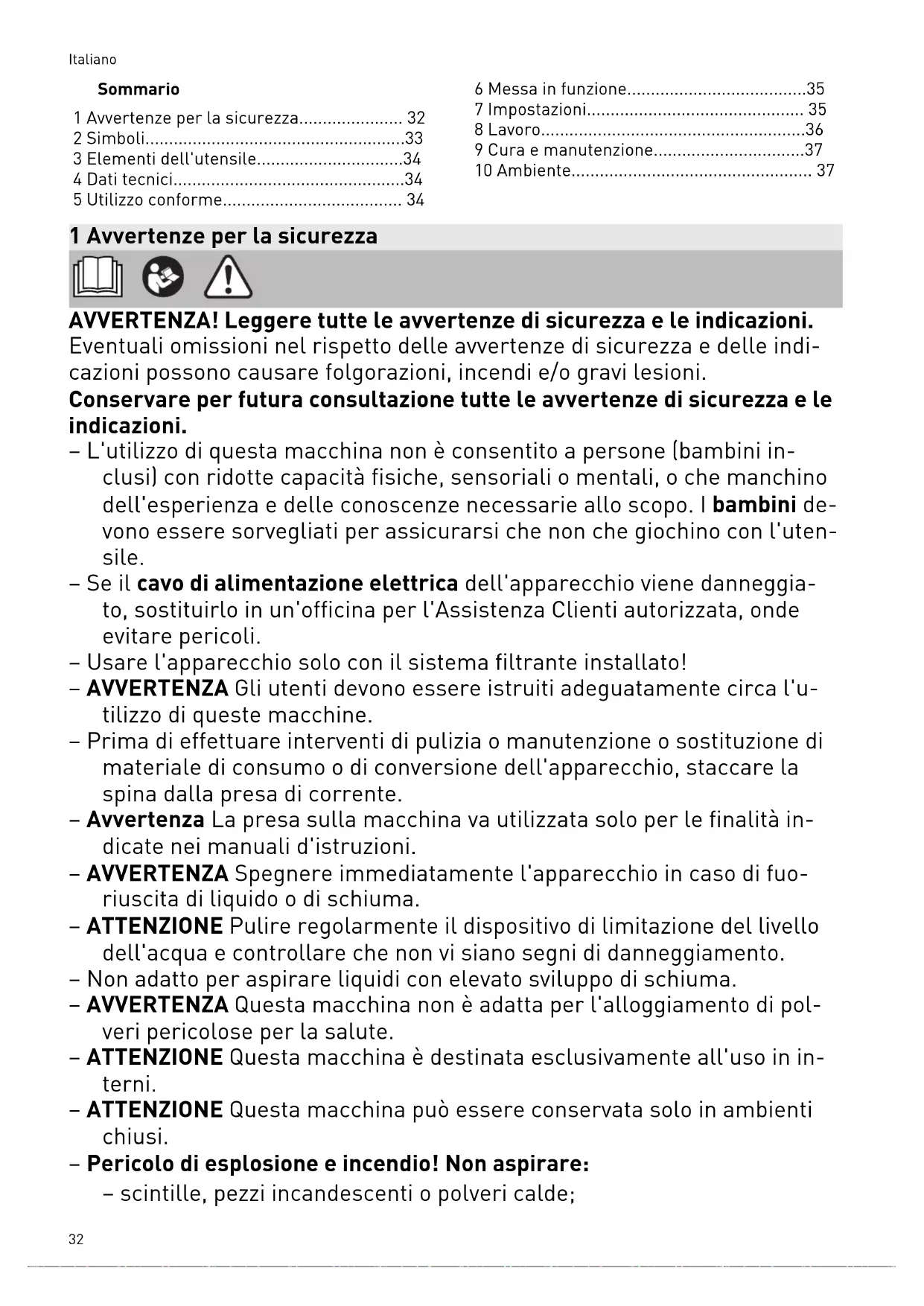 PRUDENZA Polveri nocive per la salute Lesione delle vie respiratorie ► Al termine dell'aspirazione di liquidi, ri muovere il filtro per liquidi e sostituirlo con il filtro principale per materiali asciutti. PRUDENZA Fuoriuscita di schiuma e di liquidi ► Spegnere immediatamente l'utensile e svuotarlo.
