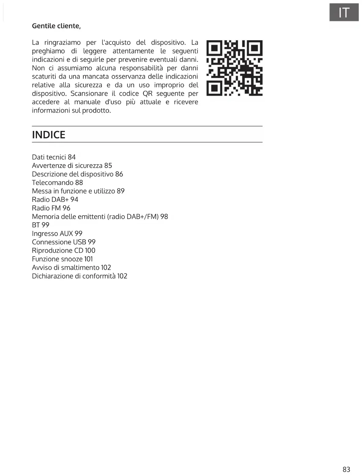 Gentile cliente, La ringraziamo per l'acquisto del dispositivo. La preghiamo di leggere attentamente le seguenti indicazioni e di seguirle per prevenire eventuali danni. Non ci assumiamo alcuna responsabilità per danni scaturiti da una mancata osservanza delle indicazioni relative alla sicurezza e da un uso improprio del dispositivo. Scansionare il codice QR seguente per accedere al manuale d'uso più attuale e ricevere informazioni sul prodotto. INDICE Dati tecnici 84 Avvertenze di sicurezza 85 Descrizione del dispositivo 86 Telecomando 88 Messa in funzione e utilizzo 89 Radio DAB+ 94 Radio FM 96 Memoria delle emittenti (radio DAB+/FM) 98 BT 99 Ingresso AUX 99 Connessione USB 99 Riproduzione CD 100 Funzione snooze 101 Avviso di smaltimento 102 Dichiarazione di conformità 10284
