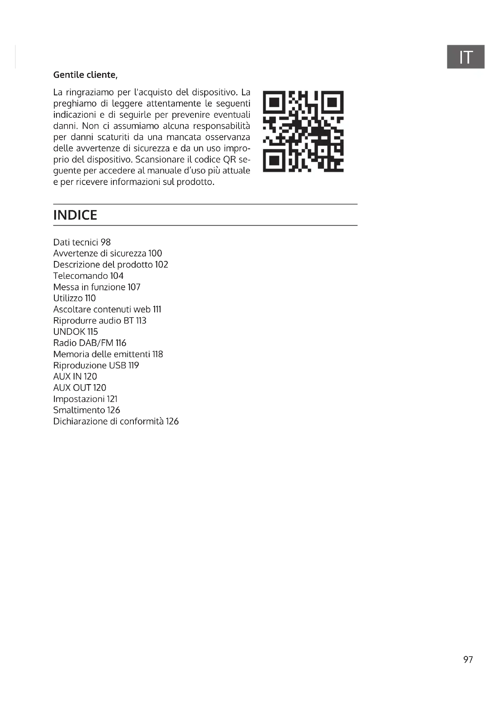 INDICE Dati tecnici 98 Avvertenze di sicurezza 100 Descrizione del prodotto 102 Telecomando 104 Messa in funzione 107 Utilizzo 110 Ascoltare contenuti web 111 Riprodurre audio BT 113 UNDOK 115 Radio DAB/FM 116 Memoria delle emittenti 118 Riproduzione USB 119 AUX IN 120 AUX OUT 120 Impostazioni 121 Smaltimento 126 Dichiarazione di conformità 126 Gentile cliente, La ringraziamo per l'acquisto del dispositivo. La preghiamo di leggere attentamente le seguenti indicazioni e di seguirle per prevenire eventuali danni. Non ci assumiamo alcuna responsabilità per danni scaturiti da una mancata osservanza delle avvertenze di sicurezza e da un uso impro- prio del dispositivo. Scansionare il codice QR se- guente per accedere al manuale d’uso più attuale e per ricevere informazioni sul prodotto.98