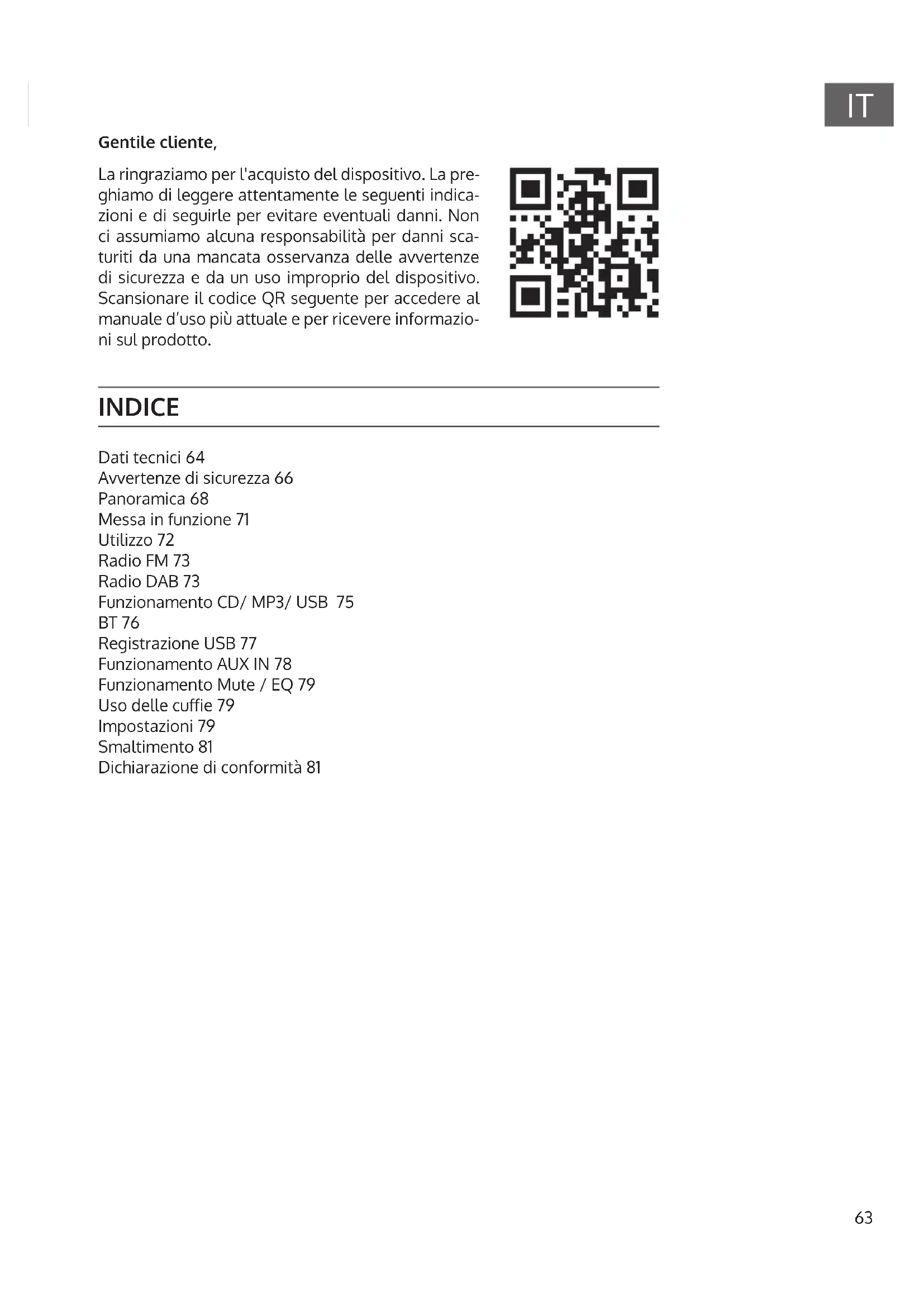 INDICE Dati tecnici 64 Avvertenze di sicurezza 66 Panoramica 68 Messa in funzione 71 Utilizzo 72 Radio FM 73 Radio DAB 73 Funzionamento CD/ MP3/ USB 75 BT 76 Registrazione USB 77 Funzionamento AUX IN 78 Funzionamento Mute / EQ 79 Uso delle cuie 79 Impostazioni 79 Smaltimento 81 Dichiarazione di conformità 81 Gentile cliente, La ringraziamo per l'acquisto del dispositivo. La pre- ghiamo di leggere attentamente le seguenti indica- zioni e di seguirle per evitare eventuali danni. Non ci assumiamo alcuna responsabilità per danni sca- turiti da una mancata osservanza delle avvertenze di sicurezza e da un uso improprio del dispositivo. Scansionare il codice QR seguente per accedere al manuale d’uso più attuale e per ricevere informazio- ni sul prodotto.64