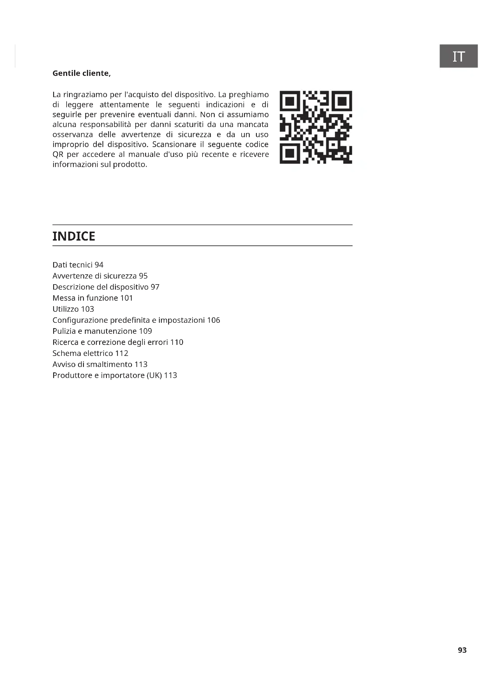 Gentile cliente, La ringraziamo per l'acquisto del dispositivo. La preghiamo di leggere attentamente le seguenti indicazioni e di seguirle per prevenire eventuali danni. Non ci assumiamo alcuna responsabilità per danni scaturiti da una mancata osservanza delle avvertenze di sicurezza e da un uso improprio del dispositivo. Scansionare il seguente codice QR per accedere al manuale d'uso più recente e ricevere informazioni sul prodotto. Dati tecnici 94 Avvertenze di sicurezza 95 Descrizione del dispositivo 97 Messa in funzione 101 Utilizzo 103 Congurazione predenita e impostazioni 106 Pulizia e manutenzione 109 Ricerca e correzione degli errori 110 Schema elettrico 112 Avviso di smaltimento 113 Produttore e importatore (UK) 113 INDICE94