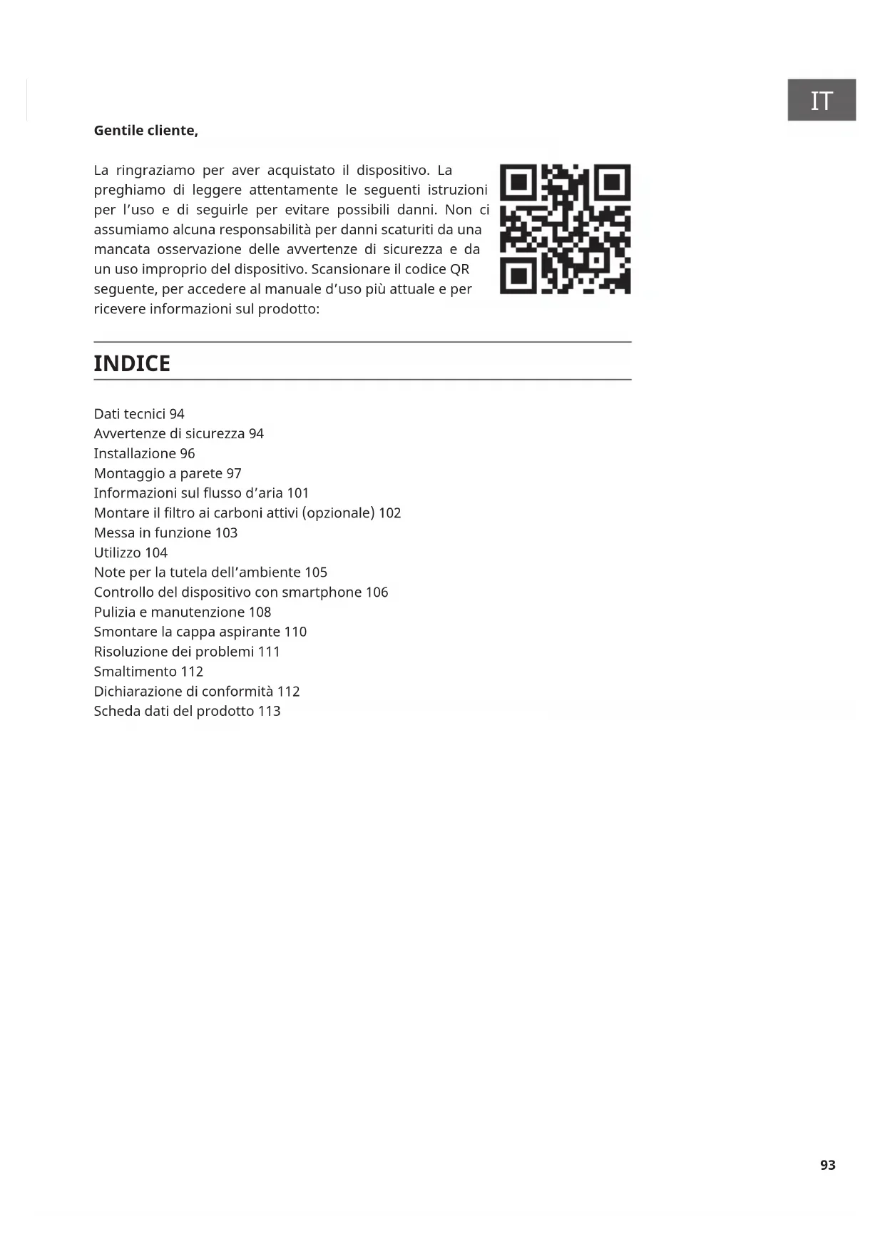 Gentile cliente, La ringraziamo per aver acquistato il dispositivo. La preghiamo di leggere attentamente le seguenti istruzioni per l’uso e di seguirle per evitare possibili danni. Non ci assumiamo alcuna responsabilità per danni scaturiti da una mancata osservazione delle avvertenze di sicurezza e da un uso improprio del dispositivo. Scansionare il codice QR seguente, per accedere al manuale d’uso più attuale e per ricevere informazioni sul prodotto: INDICE Dati tecnici 94 Avvertenze di sicurezza 94 Installazione 96 Montaggio a parete 97 Informazioni sul usso d’aria 101 Montare il ltro ai carboni attivi (opzionale) 102 Messa in funzione 103 Utilizzo 104 Note per la tutela dell’ambiente 105 Controllo del dispositivo con smartphone 106 Pulizia e manutenzione 108 Smontare la cappa aspirante 110 Risoluzione dei problemi 111 Smaltimento 112 Dichiarazione di conformità 112 Scheda dati del prodotto 11394