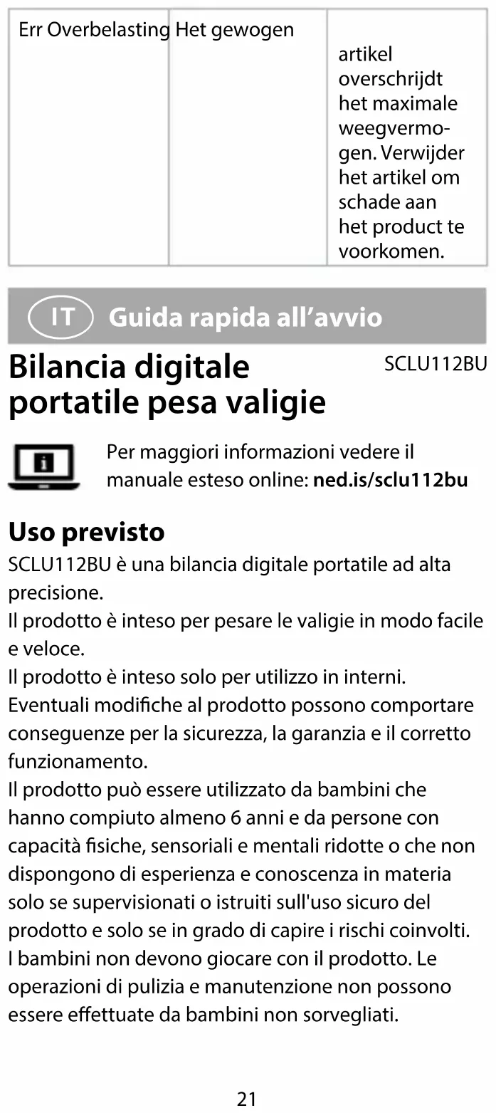 Guida rapida all’avvio Bilancia digitale portatile pesa valigie SCLU112BU Per maggiori informazioni vedere il manuale esteso online: ned.is/sclu112bu Uso previsto SCLU112BU è una bilancia digitale portatile ad alta precisione. Il prodotto è inteso per pesare le valigie in modo facile e veloce. Il prodotto è inteso solo per utilizzo in interni. Eventuali modiche al prodotto possono comportare conseguenze per la sicurezza, la garanzia e il corretto funzionamento. Il prodotto può essere utilizzato da bambini che hanno compiuto almeno 6 anni e da persone con capacità siche, sensoriali e mentali ridotte o che non dispongono di esperienza e conoscenza in materia solo se supervisionati o istruiti sull'uso sicuro del prodotto e solo se in grado di capire i rischi coinvolti. I bambini non devono giocare con il prodotto. Le operazioni di pulizia e manutenzione non possono essere eettuate da bambini non sorvegliati.22 Parti principali (immagine A) 1 Display 2 Anello triangolare 3 Pulsante di accensione e Z/T 4 Pulsante Unità di misura 5 Cinta 6 Gancio 7 Batteria 8 Vano batteria 9 Coperchio della batteria Istruzioni di sicurezza