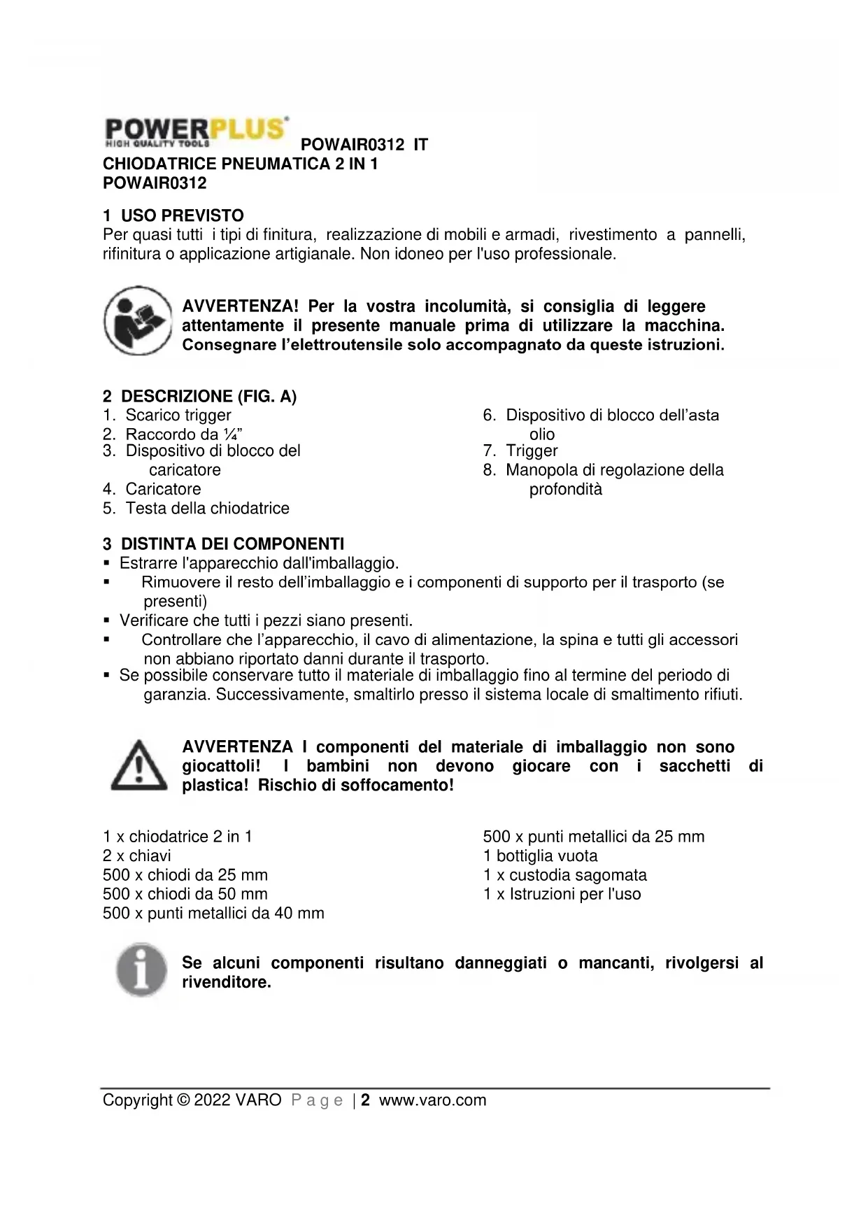 - Al fine di evitare qualsiasi rischio di lesione per l’operatore e per eventuali presenti, consultare le sezioni relative all’uso dell’apparecchio, alla manutenzione e alla risoluzione dei guasti per ottenere ulteriori informazioni (Fig. 1)POWAIR0312 IT Copyright © 2022 VARO P a g e | 6 www.varo.com