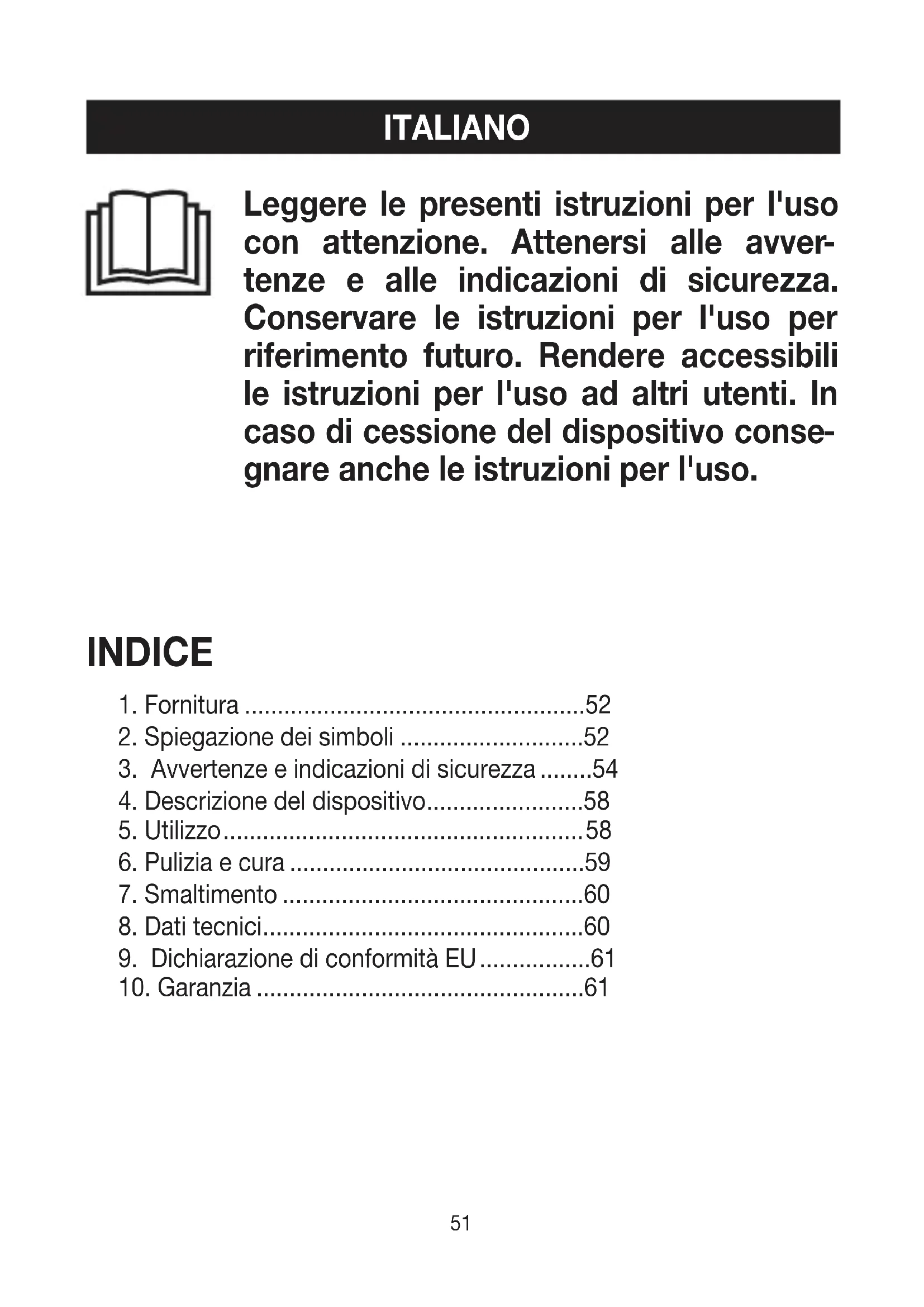 tenze e alle indicazioni di sicurezza. Conservare le istruzioni per l'uso per riferimento futuro. Rendere accessibili le istruzioni per l'uso ad altri utenti. In caso di cessione del dispositivo conse