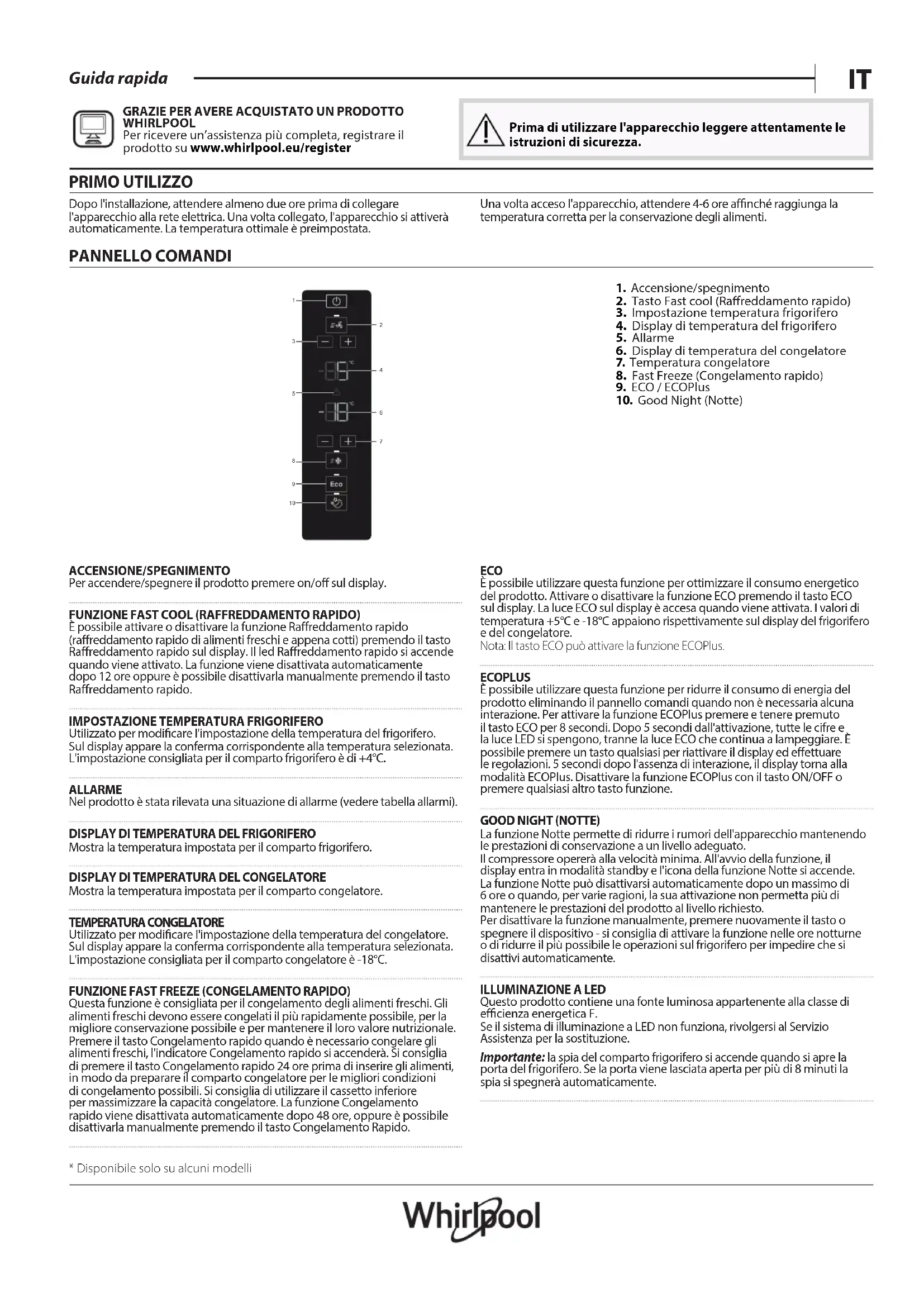 WHIRLPOOL Per ricevere un’assistenza più completa, registrare il prodotto su www . whirlpool . eu/ register Prima di utilizzare l'apparecchio leggere attentamente le istruzioni di sicurezza. PRIMO UTILIZZO Dopo l'installazione, attendere almeno due ore prima di collegare l'apparecchio alla rete elettrica. Una volta collegato, l'apparecchio si attiverà automaticamente. La temperatura ottimale è preimpostata. Una volta acceso l'apparecchio, attendere 4-6 ore anché raggiunga la temperatura corretta per la conservazione degli alimenti. PANNELLO COMANDI