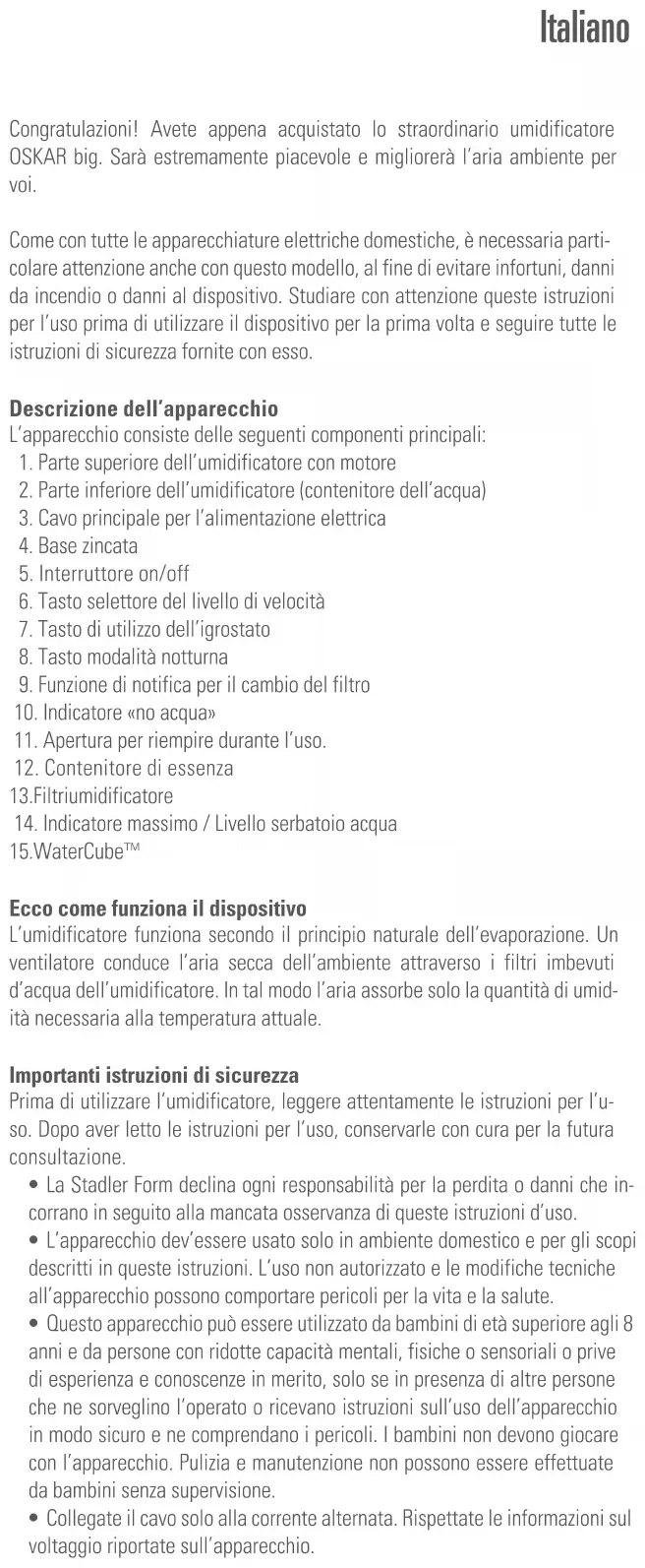 - Per l’utilizzo igienico ed ottimale dell’umidificatore, i filtri deve essere sostituito ogni 2–3 mesi. Se il filtro rimane in uso più a lungo, da una parte l’uscita dell’umidità potrebbe diminuire sensibilmente e, dall’altra, l’azione antimicrobica dei filtri potrebbe non essere più garantita. I filtri umidificatore può essere acquistato presso il rivenditore dove avete ac- quistato Oskar big. Water Cube™ – igiene ottimale per il suo umidificatore Water Cube™ (15) di Stadler Form assicura un’igiene ottimale del vostro umidificatore. L’impiego di Water Cube consente un utilizzo ottimale dell’u- midificatore e ne prolunga la durata. Water Cube agisce anche con l’appa- recchio spento e ne assicura la freschezza per tutta la stagione. Si consiglia la sostituzione di Water Cube all’inizio di ogni stagione di utilizzo dell’umi- dificatore. Riparazione