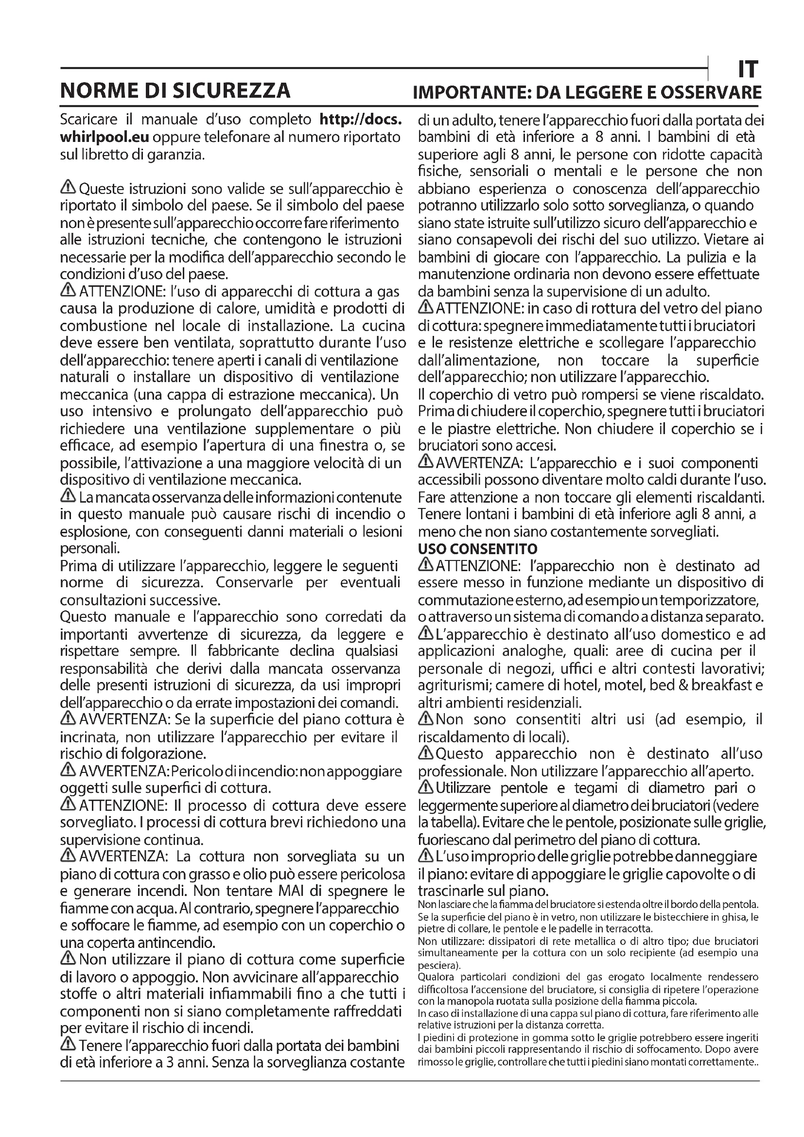 Scaricare il manuale d’uso completo http://docs. whirlpool.eu oppure telefonare al numero riportato sul libretto di garanzia. Queste istruzioni sono valide se sull’apparecchio è riportato il simbolo del paese. Se il simbolo del paese non è presente sull’apparecchio occorre fare riferimento alle istruzioni tecniche, che contengono le istruzioni necessarie per la modica dell’apparecchio secondo le condizioni d’uso del paese. ATTENZIONE: l’uso di apparecchi di cottura a gas causa la produzione di calore, umidità e prodotti di combustione nel locale di installazione. La cucina deve essere ben ventilata, soprattutto durante l’uso dell’apparecchio: tenere aperti i canali di ventilazione naturali o installare un dispositivo di ventilazione meccanica (una cappa di estrazione meccanica). Un uso intensivo e prolungato dell’apparecchio può richiedere una ventilazione supplementare o più ecace, ad esempio l’apertura di una nestra o, se possibile, l’attivazione a una maggiore velocità di un dispositivo di ventilazione meccanica. La mancata osservanza delle informazioni contenute in questo manuale può causare rischi di incendio o esplosione, con conseguenti danni materiali o lesioni personali. Prima di utilizzare l’apparecchio, leggere le seguenti norme di sicurezza. Conservarle per eventuali consultazioni successive. Questo manuale e l’apparecchio sono corredati da importanti avvertenze di sicurezza, da leggere e rispettare sempre. Il fabbricante declina qualsiasi responsabilità che derivi dalla mancata osservanza delle presenti istruzioni di sicurezza, da usi impropri dell’apparecchio o da errate impostazioni dei comandi. AVVERTENZA: Se la supercie del piano cottura è incrinata, non utilizzare l’apparecchio per evitare il rischio di folgorazione. AVVERTENZA: Pericolo di incendio: non appoggiare oggetti sulle superci di cottura. ATTENZIONE: Il processo di cottura deve essere sorvegliato. I processi di cottura brevi richiedono una supervisione continua. AVVERTENZA: La cottura non sorvegliata su un piano di cottura con grasso e olio può essere pericolosa e generare incendi. Non tentare MAI di spegnere le amme con acqua. Al contrario, spegnere l’apparecchio e soocare le amme, ad esempio con un coperchio o una coperta antincendio. Non utilizzare il piano di cottura come supercie di lavoro o appoggio. Non avvicinare all’apparecchio stoe o altri materiali inammabili no a che tutti i componenti non si siano completamente rareddati per evitare il rischio di incendi. Tenere l’apparecchio fuori dalla portata dei bambini di età inferiore a 3 anni. Senza la sorveglianza costante di un adulto, tenere l’apparecchio fuori dalla portata dei bambini di età inferiore a 8 anni. I bambini di età superiore agli 8 anni, le persone con ridotte capacità siche, sensoriali o mentali e le persone che non abbiano esperienza o conoscenza dell’apparecchio potranno utilizzarlo solo sotto sorveglianza, o quando siano state istruite sull’utilizzo sicuro dell’apparecchio e siano consapevoli dei rischi del suo utilizzo. Vietare ai bambini di giocare con l’apparecchio. La pulizia e la manutenzione ordinaria non devono essere eettuate da bambini senza la supervisione di un adulto. ATTENZIONE: in caso di rottura del vetro del piano di cottura: spegnere immediatamente tutti i bruciatori e le resistenze elettriche e scollegare l’apparecchio dall’alimentazione, non toccare la supercie dell’apparecchio; non utilizzare l’apparecchio. Il coperchio di vetro può rompersi se viene riscaldato. Prima di chiudere il coperchio, spegnere tutti i bruciatori e le piastre elettriche. Non chiudere il coperchio se i bruciatori sono accesi. AVVERTENZA: L’apparecchio e i suoi componenti accessibili possono diventare molto caldi durante l’uso. Fare attenzione a non toccare gli elementi riscaldanti. Tenere lontani i bambini di età inferiore agli 8 anni, a meno che non siano costantemente sorvegliati. USO CONSENTITO ATTENZIONE: l’apparecchio non è destinato ad essere messo in funzione mediante un dispositivo di commutazione esterno, ad esempio un temporizzatore, o attraverso un sistema di comando a distanza separato. L’apparecchio è destinato all’uso domestico e ad applicazioni analoghe, quali: aree di cucina per il personale di negozi, uci e altri contesti lavorativi; agriturismi; camere di hotel, motel, bed & breakfast e altri ambienti residenziali. Non sono consentiti altri usi (ad esempio, il riscaldamento di locali). Questo apparecchio non è destinato all’uso professionale. Non utilizzare l’apparecchio all’aperto. Utilizzare pentole e tegami di diametro pari o leggermente superiore al diametro dei bruciatori (vedere la tabella). Evitare che le pentole, posizionate sulle griglie, fuoriescano dal perimetro del piano di cottura. L’uso improprio delle griglie potrebbe danneggiare il piano: evitare di appoggiare le griglie capovolte o di trascinarle sul piano. Non lasciare che la amma del bruciatore si estenda oltre il bordo della pentola.Se la supercie del piano è in vetro, non utilizzare le bistecchiere in ghisa, le pietre di collare, le pentole e le padelle in terracotta.Non utilizzare: dissipatori di rete metallica o di altro tipo; due bruciatori simultaneamente per la cottura con un solo recipiente (ad esempio una pesciera).Qualora particolari condizioni del gas erogato localmente rendessero dicoltosa l’accensione del bruciatore, si consiglia di ripetere l’operazione con la manopola ruotata sulla posizione della amma piccola.In caso di installazione di una cappa sul piano di cottura, fare riferimento alle relative istruzioni per la distanza corretta.I piedini di protezione in gomma sotto le griglie potrebbero essere ingeriti dai bambini piccoli rappresentando il rischio di soocamento. Dopo avere rimosso le griglie, controllare che tutti i piedini siano montati correttamente..INSTALLAZIONE Per evitare il rischio di lesioni personali, le operazioni di movimentazio