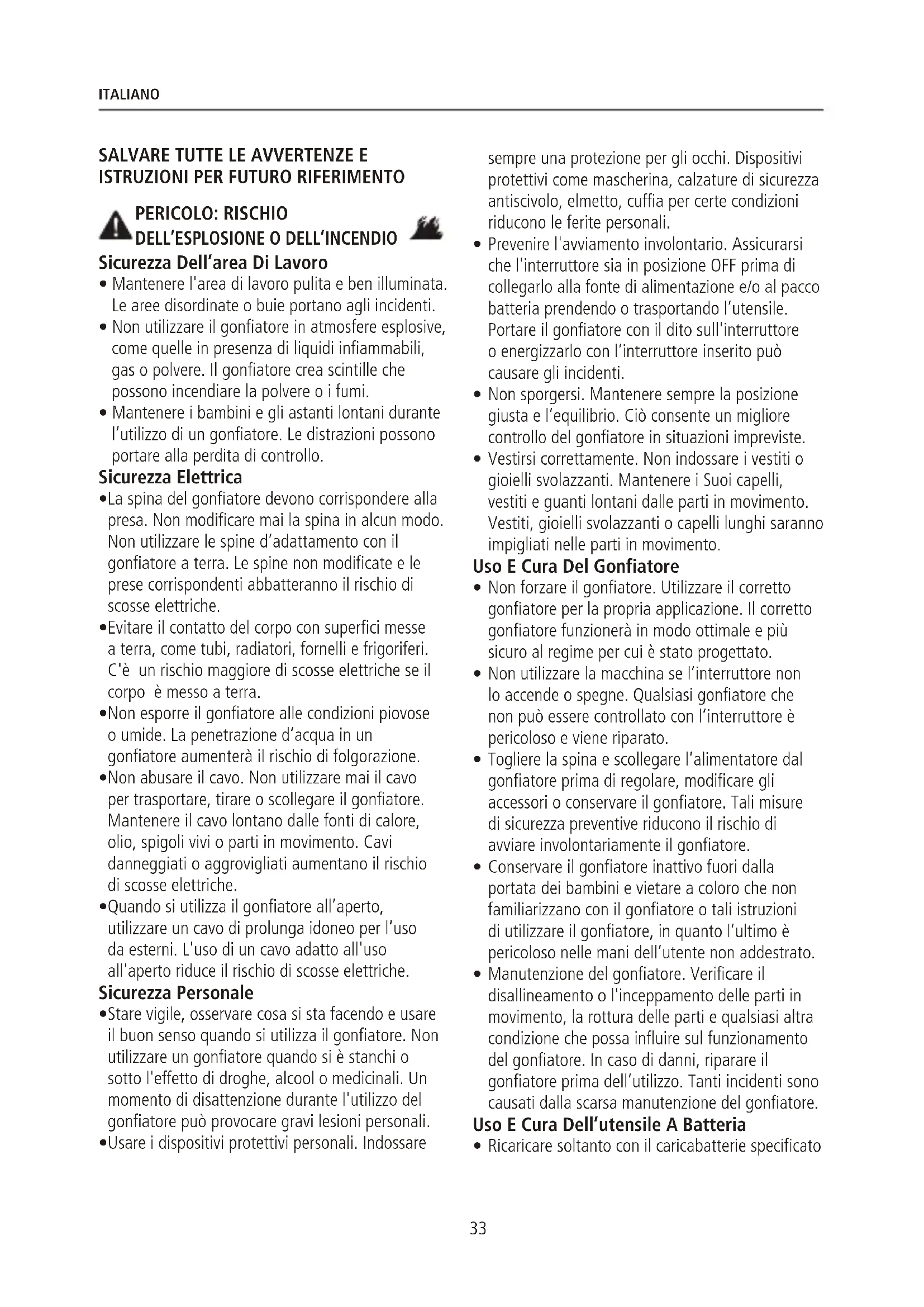 Non forzare il gonfiatore. Utilizzare il corretto gonfiatore per la propria applicazione. Il corretto gonfiatore funzionerà in modo ottimale e più sicuro al regime per cui è stato progettato. Non utilizzare la macchina se l’interruttore non lo accende o spegne. Qualsiasi gonfiatore che non può essere controllato con l’interruttore è pericoloso e viene riparato. Togliere la spina e scollegare l’alimentatore dal gonfiatore prima di regolare, modificare gli accessori o conservare il gonfiatore. Tali misure di sicurezza preventive riducono il rischio di avviare involontariamente il gonfiatore. Conservare il gonfiatore inattivo fuori dalla portata dei bambini e vietare a coloro che non familiarizzano con il gonfiatore o tali istruzioni di utilizzare il gonfiatore, in quanto l’ultimo è pericoloso nelle mani dell’utente non addestrato. Manutenzione del gonfiatore. Verificare il disallineamento o l'inceppamento delle parti in movimento, la rottura delle parti e qualsiasi altra condizione che possa influire sul funzionamento del gonfiatore. In caso di danni, riparare il gonfiatore prima dell’utilizzo. Tanti incidenti sono causati dalla scarsa manutenzione del gonfiatore. Ricaricare soltanto con il caricabatterie specificato34