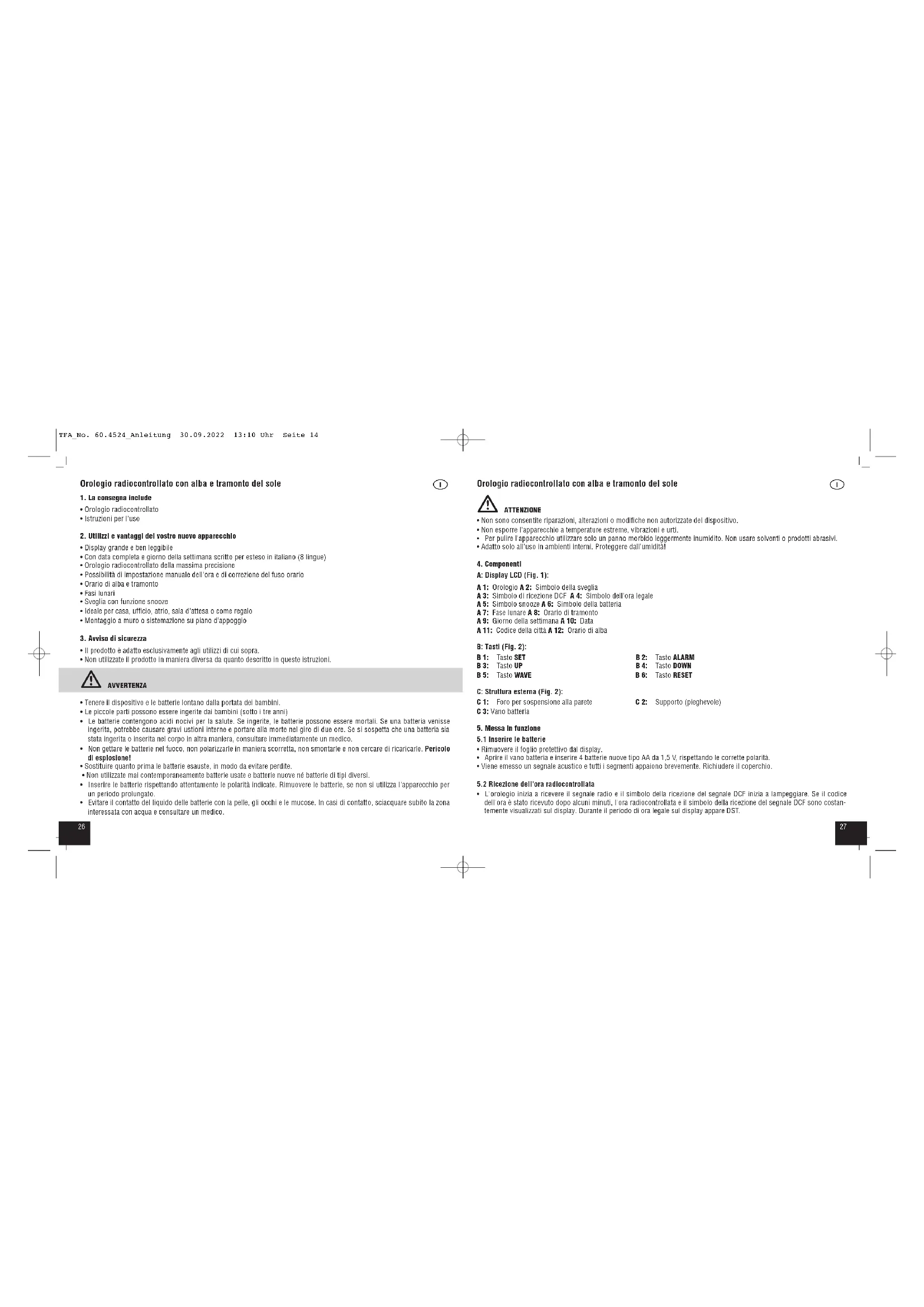 - Per disattivare/attivare la funzione sveglia premere il tasto UP in modalità di allarme. TFA_No. 60.4524_Anleitung 30.09.2022 13:10 Uhr Seite 153130 Orologio radiocontrollato con alba e tramonto del sole