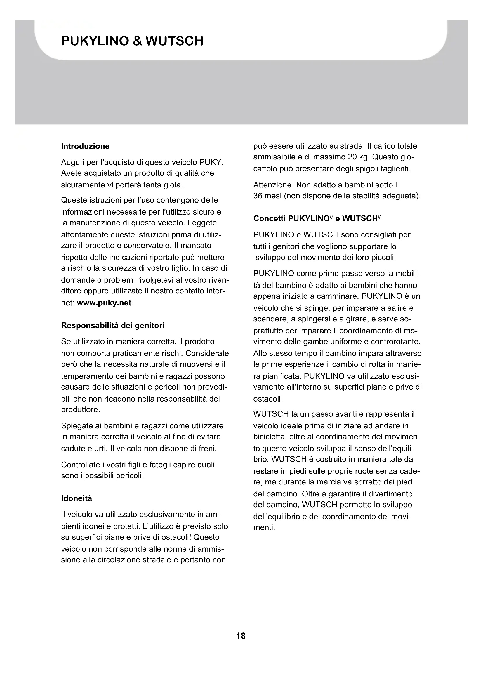 PUKYLINO e WUTSCH sono consigliati per tutti i genitori che vogliono supportare lo sviluppo del movimento dei loro piccoli. PUKYLINO come primo passo verso la mobili- tà del bambino è adatto ai bambini che hanno appena iniziato a camminare. PUKYLINO è un veicolo che si spinge, per imparare a salire e scendere, a spingersi e a girare, e serve so- prattutto per imparare il coordinamento di mo- vimento delle gambe uniforme e controrotante. Allo stesso tempo il bambino impara attraverso le prime esperienze il cambio di rotta in manie- ra pianificata. PUKYLINO va utilizzato esclusi- vamente all’interno su superfici piane e prive di ostacoli! WUTSCH fa un passo avanti e rappresenta il veicolo ideale prima di iniziare ad andare in bicicletta: oltre al coordinamento del movimen- to questo veicolo sviluppa il senso dell’equili- brio. WUTSCH è costruito in maniera tale da restare in piedi sulle proprie ruote senza cade- re, ma durante la marcia va sorretto dai piedi del bambino. Oltre a garantire il divertimento del bambino, WUTSCH permette lo sviluppo dell’equilibrio e del coordinamento dei movi- menti.19 Istruzioni per l’uso IPUKYLINO & WUTSCH Avvertimenti per l’utilizzo É necessario indossare scarpe chiuse. Il vei- colo non deve essere utilizzato vicino a scale, scarpate, piscine o comunque vicino all’acqua. Le scale nelle vicinanze devono essere messe in sicurezza in maniera tale da evitare assolu- tamente che i bambini possano percorrerle con il veicolo. Vale la garanzia prevista dalla legge. I danni causati da uso improprio, violenza, mancata manutenzione o per normale usura sono esclusi da tale garanzia. Marchio CE Il veicolo corrisponde alle direttive europee 2009/48/EG in materia di sicurezza dei giocat- toli e per questo motivo è contrassegnato con il simbolo CE. Targhetta La targhetta è posizionata sotto al lato poste- riore del telaio. Annotate le indicazioni della targhetta nel libretto del veicolo alla fine delle presenti istruzioni per l’uso. Vi saranno utili in caso di domande o per ordinare dei pezzi di ricambio. Manutenzione e cura Prima di utilizzare il veicolo, controllate che i pezzi non presentino usure e che le viti siano salde. I dadi che si avvitano da soli in caso di smontaggio completo vanno sostituiti! Al fine di garantire l’alto livello di sicurezza, i pezzi usurati o difettosi vanno sostituiti imme- diatamente con pezzi di ricambio PUKY origi- nali. Per motivi di sicurezza il veicolo non va utiliz- zato fino a quando non sarà riparato. I pezzi deformati non vanno sistemati, ma sostituiti. Pezzi di usura: ruote, arresto dell’asse (solo per WUTSCH) Il veicolo non va lavato con pulitori ad alta pressione. Pulite il veicolo con acqua e sapone e asciugatelo con un panno morbido. Tenete il veicolo lontano da materiali corrosivi (sale utilizzato su strada, sale marino, concime). Non deponete il veicolo in ambienti umidi. Eliminazione dell’imballaggio e contenuto Non utilizzate oggetti contundenti per aprire l’imballaggio ed eliminare il materiale di prote- zione. Potreste inavvertitamente danneggiare la vernice o dei pezzi del veicolo. ❚ Estraete tutti i pezzi dall’imballaggio. ❚ Eliminate il materiale di protezione. Tenete ogni tipo di imballaggio lontano dai bambini, potrebbe causare il soffocamento. ❚ Verificate che siano presenti tutti i pezzi e che non vi siano dei difetti. Se dovesse mancare un pezzo, prima di iniziare il lavoro rivolgetevi al vostro rivenditore. La fornitura di PUKYLINO