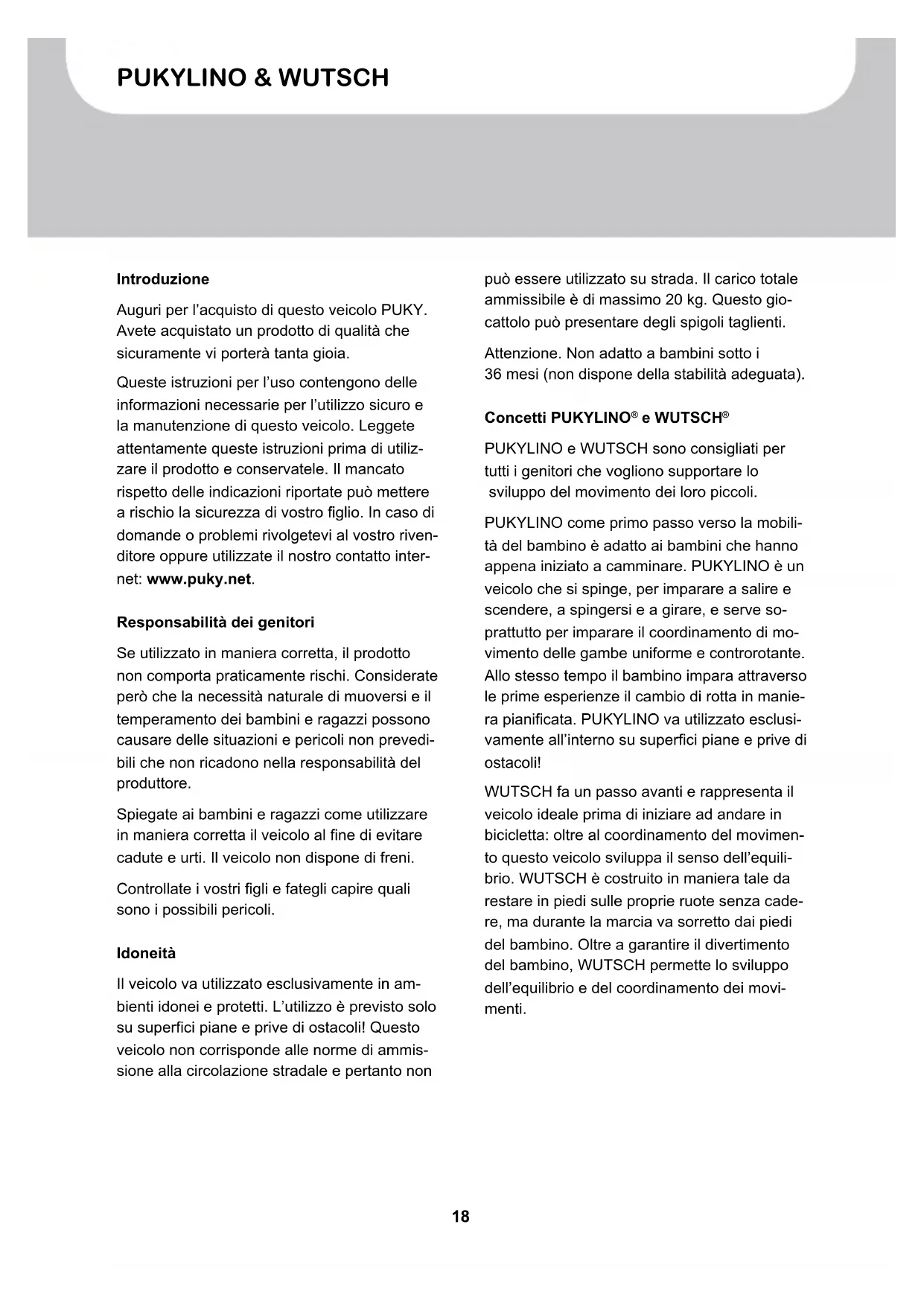 PUKYLINO e WUTSCH sono consigliati per tutti i genitori che vogliono supportare lo sviluppo del movimento dei loro piccoli. PUKYLINO come primo passo verso la mobili- tà del bambino è adatto ai bambini che hanno appena iniziato a camminare. PUKYLINO è un veicolo che si spinge, per imparare a salire e scendere, a spingersi e a girare, e serve so- prattutto per imparare il coordinamento di mo- vimento delle gambe uniforme e controrotante. Allo stesso tempo il bambino impara attraverso le prime esperienze il cambio di rotta in manie- ra pianificata. PUKYLINO va utilizzato esclusi- vamente all’interno su superfici piane e prive di ostacoli! WUTSCH fa un passo avanti e rappresenta il veicolo ideale prima di iniziare ad andare in bicicletta: oltre al coordinamento del movimen- to questo veicolo sviluppa il senso dell’equili- brio. WUTSCH è costruito in maniera tale da restare in piedi sulle proprie ruote senza cade- re, ma durante la marcia va sorretto dai piedi del bambino. Oltre a garantire il divertimento del bambino, WUTSCH permette lo sviluppo dell’equilibrio e del coordinamento dei movi- menti.19 Istruzioni per l’uso IPUKYLINO & WUTSCH Avvertimenti per l’utilizzo É necessario indossare scarpe chiuse. Il vei- colo non deve essere utilizzato vicino a scale, scarpate, piscine o comunque vicino all’acqua. Le scale nelle vicinanze devono essere messe in sicurezza in maniera tale da evitare assolu- tamente che i bambini possano percorrerle con il veicolo. Vale la garanzia prevista dalla legge. I danni causati da uso improprio, violenza, mancata manutenzione o per normale usura sono esclusi da tale garanzia. Marchio CE Il veicolo corrisponde alle direttive europee 2009/48/EG in materia di sicurezza dei giocat- toli e per questo motivo è contrassegnato con il simbolo CE. Targhetta La targhetta è posizionata sotto al lato poste- riore del telaio. Annotate le indicazioni della targhetta nel libretto del veicolo alla fine delle presenti istruzioni per l’uso. Vi saranno utili in caso di domande o per ordinare dei pezzi di ricambio. Manutenzione e cura Prima di utilizzare il veicolo, controllate che i pezzi non presentino usure e che le viti siano salde. I dadi che si avvitano da soli in caso di smontaggio completo vanno sostituiti! Al fine di garantire l’alto livello di sicurezza, i pezzi usurati o difettosi vanno sostituiti imme- diatamente con pezzi di ricambio PUKY origi- nali. Per motivi di sicurezza il veicolo non va utiliz- zato fino a quando non sarà riparato. I pezzi deformati non vanno sistemati, ma sostituiti. Pezzi di usura: ruote, arresto dell’asse (solo per WUTSCH) Il veicolo non va lavato con pulitori ad alta pressione. Pulite il veicolo con acqua e sapone e asciugatelo con un panno morbido. Tenete il veicolo lontano da materiali corrosivi (sale utilizzato su strada, sale marino, concime). Non deponete il veicolo in ambienti umidi. Eliminazione dell’imballaggio e contenuto Non utilizzate oggetti contundenti per aprire l’imballaggio ed eliminare il materiale di prote- zione. Potreste inavvertitamente danneggiare la vernice o dei pezzi del veicolo. ❚ Estraete tutti i pezzi dall’imballaggio. ❚ Eliminate il materiale di protezione. Tenete ogni tipo di imballaggio lontano dai bambini, potrebbe causare il soffocamento. ❚ Verificate che siano presenti tutti i pezzi e che non vi siano dei difetti. Se dovesse mancare un pezzo, prima di iniziare il lavoro rivolgetevi al vostro rivenditore. La fornitura di PUKYLINO