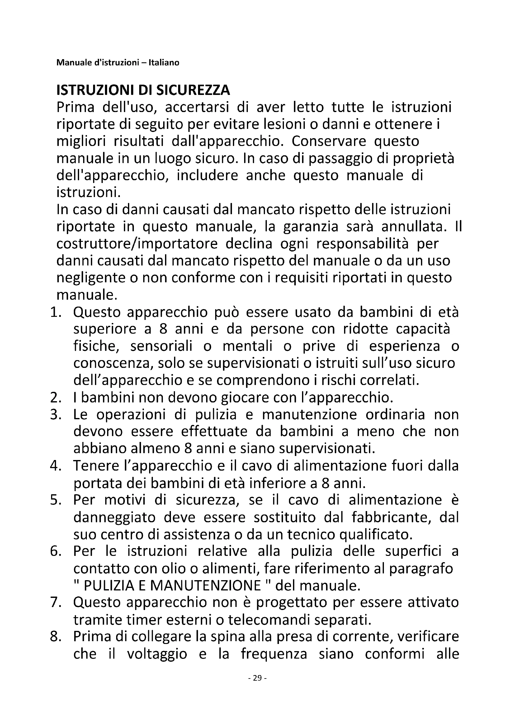 Prima dell'uso, accertarsi di aver letto tutte le istruzioni riportate di seguito per evitare lesioni o danni e ottenere i migliori risultati dall'apparecchio. Conservare questo manuale in un luogo sicuro. In caso di passaggio di proprietà dell'apparecchio, includere anche questo manuale di istruzioni. In caso di danni causati dal mancato rispetto delle istruzioni riportate in questo manuale, la garanzia sarà annullata. Il costruttore/importatore declina ogni responsabilità per danni causati dal mancato rispetto del manuale o da un uso negligente o non conforme con i requisiti riportati in questo manuale.
