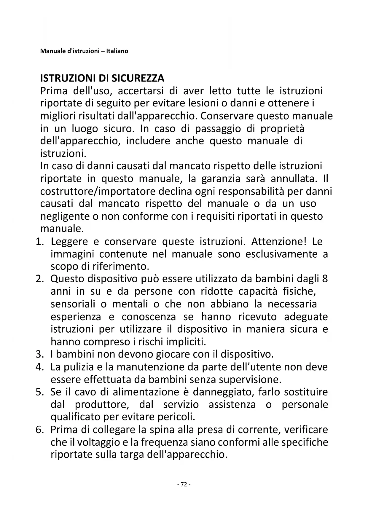 Prima dell'uso, accertarsi di aver letto tutte le istruzioni riportate di seguito per evitare lesioni o danni e ottenere i migliori risultati dall'apparecchio. Conservare questo manuale in un luogo sicuro. In caso di passaggio di proprietà dell'apparecchio, includere anche questo manuale di istruzioni. In caso di danni causati dal mancato rispetto delle istruzioni riportate in questo manuale, la garanzia sarà annullata. Il costruttore/importatore declina ogni responsabilità per danni causati dal mancato rispetto del manuale o da un uso negligente o non conforme con i requisiti riportati in questo manuale.