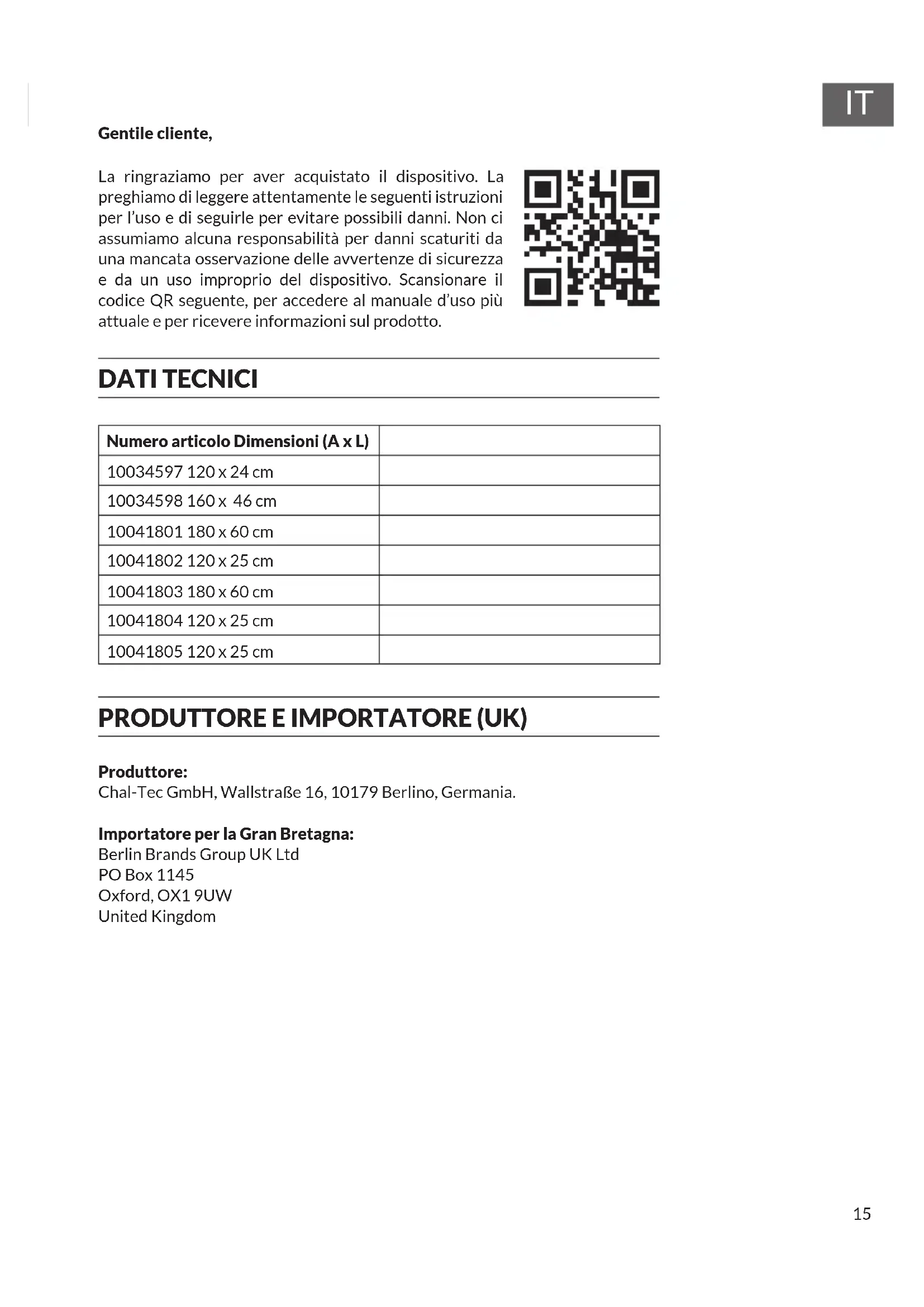 Gentile cliente, La ringraziamo per aver acquistato il dispositivo. La preghiamo di leggere attentamente le seguenti istruzioni per l’uso e di seguirle per evitare possibili danni. Non ci assumiamo alcuna responsabilità per danni scaturiti da una mancata osservazione delle avvertenze di sicurezza e da un uso improprio del dispositivo. Scansionare il codice QR seguente, per accedere al manuale d’uso più attuale e per ricevere informazioni sul prodotto. DATI TECNICI Numero articolo Dimensioni (A x L) 10034597 120 x 24 cm 10034598 160 x 46 cm 10041801 180 x 60 cm 10041802 120 x 25 cm 10041803 180 x 60 cm 10041804 120 x 25 cm 10041805 120 x 25 cm PRODUTTORE E IMPORTATORE (UK) Produttore: Chal-Tec GmbH, Wallstraße 16, 10179 Berlino, Germania. Importatore per la Gran Bretagna: Berlin Brands Group UK Ltd PO Box 1145 Oxford, OX1 9UW United Kingdom16