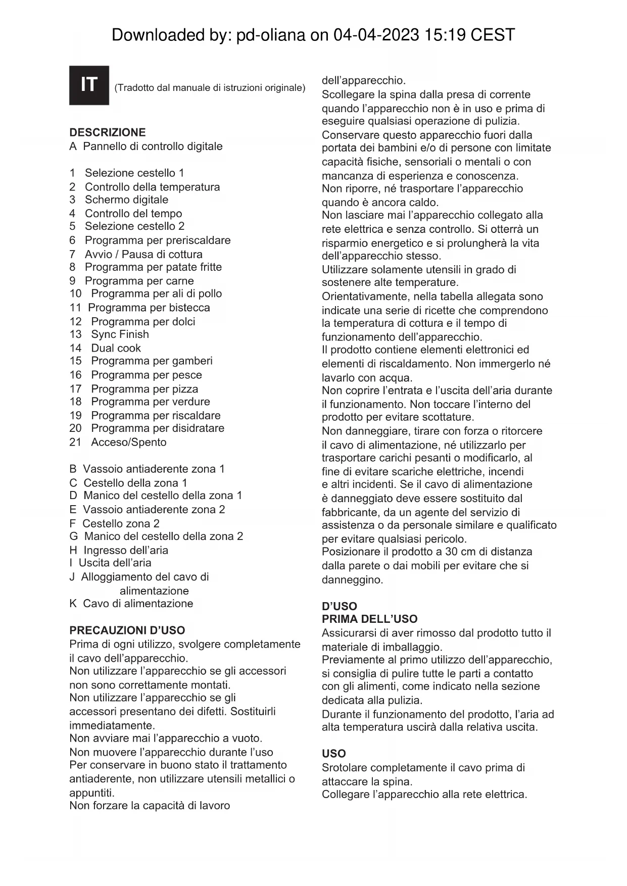 Il AIR FRYER non funziona. L’apparecchio non è collegato alla rete elettrica. Collegare l’apparecchio a una presa con presa a terra. Il temporizzatore non è congurato. Per accendere l’apparecchio, premere il pulsante del temporizzatore no ad ottenere il tempo di preparazione necessario. Gli alimenti fritti non sono completamente cotti. La quantità di alimenti nel cestello è eccessiva. Inserire una minor quantità di ingredienti nel cestello. Minori quantità si smuovono meglio e si friggono uniformemente. La temperatura selezionata è troppo bassa. Aumentare la temperatura no ad arrivare alla posizione adeguata. Regolare la temperatura: consultare la guida per la cottura. Gli alimenti non friggono uniformemente. Alcuni ingredienti devono essere smossi a metà del tempo di cottura. Quando gli alimenti sono uno sopra l’altro (ad esempio, le patate fritte), bisogna smuoverli alla metà del tempo di cottura. I fritti non sono croccanti. Si sta usando un tipo di alimento non corretto. Consultare la modalità di preparazione degli alimenti, fornita dal produttore. cestello sovraccarico. Non riempire il cestello oltre l’indicazione MAX. Non è possibile far scorrere la padella/cestello nell’apparecchio. Il cestello non è posizionato correttamente nel secchiello. Premere il cestello nella padella no a sentire un clic. L’apparecchio emette un fumo bianco. Si stanno preparando ingredienti con un alto contenuto d’olio. È stato aggiunto olio alla preparazione. Non utilizzare alimenti con alti contenuti d’olio né aggiungere più olio di quello strettamente necessario. Questa friggitrice utilizza una tecnologia che richiede poco olio o non ne richiede. Nella padella ci sono resti di grasso di precedenti cotture. Il fumo bianco è causato dal grasso che si scalda nel secchiello. Downloaded by: pd-oliana on 04-04-2023 15:19 CESTCA (Traduït a partir de les instruccions originals) DESCRIPCIÓ A Tauler de control digital 1 Selecció cistella 1 2 Control de temperatura 3 Pantalla digital 4 Control de temps 5 Selecció cistella 2 6 Programa de preescalfar 7 Inici / Pausa de la cocció 8 Programa de patates fregides 9 Programa de carn 10 Programa d’aletes de pollastre 11 Programa de let 12 Programa de rebosteria 13 Sync Finish 14 Dual cook 15 Programa de gambes 16 Programa de peix 17 Programa de pizza 18 Programa de verdures 19 Programa de reescalfar 20 Programa de deshidratar 21 Engegada/Apagada B. Safata antiadherent zona 1 C. Cistella de la zona 1 D. Nansa de la cistella de la zona 1 E. Safata antiadherent zona 2 F. Cistella de la zona 2 G. Nansa de la cistella de la zona 2 H. Entrada d’aire