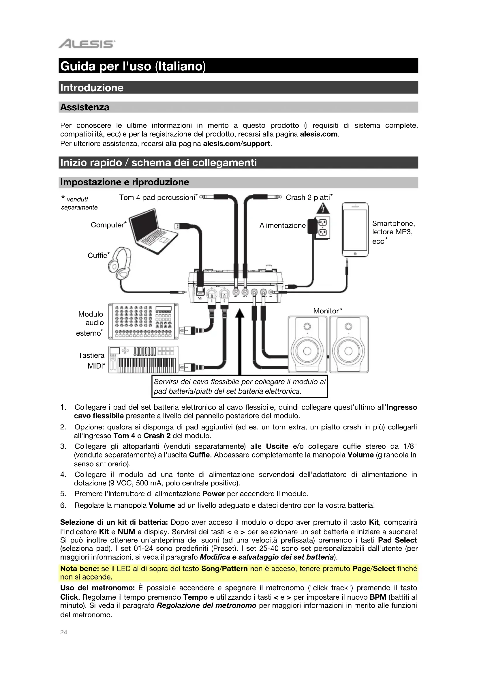 Guida per l'uso (Italiano) Introduzione Assistenza Per conoscere le ultime informazioni in merito a questo prodotto (i requisiti di sistema complete, compatibilità, ecc) e per la registrazione del prodotto, recarsi alla pagina alesis.com. Per ulteriore assistenza, recarsi alla pagina alesis.com/support. Inizio rapido / schema dei collegamenti Impostazione e riproduzione