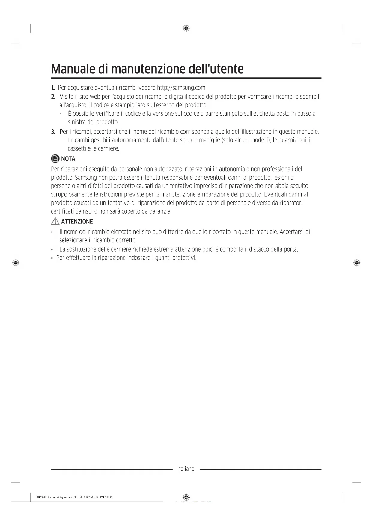 - I ricambi gestibili autonomamente dall'utente sono le maniglie (solo alcuni modelli), le guarnizioni, i cassetti e le cerniere. NOTA Per riparazioni eseguite da personale non autorizzato, riparazioni in autonomia o non professionali del prodotto, Samsung non potrà essere ritenuta responsabile per eventuali danni al prodotto, lesioni a persone o altri difetti del prodotto causati da un tentativo impreciso di riparazione che non abbia seguito scrupolosamente le istruzioni previste per la manutenzione e riparazione del prodotto. Eventuali danni al prodotto causati da un tentativo di riparazione del prodotto da parte di personale diverso da riparatori certicati Samsung non sarà coperto da garanzia. ATTENZIONE