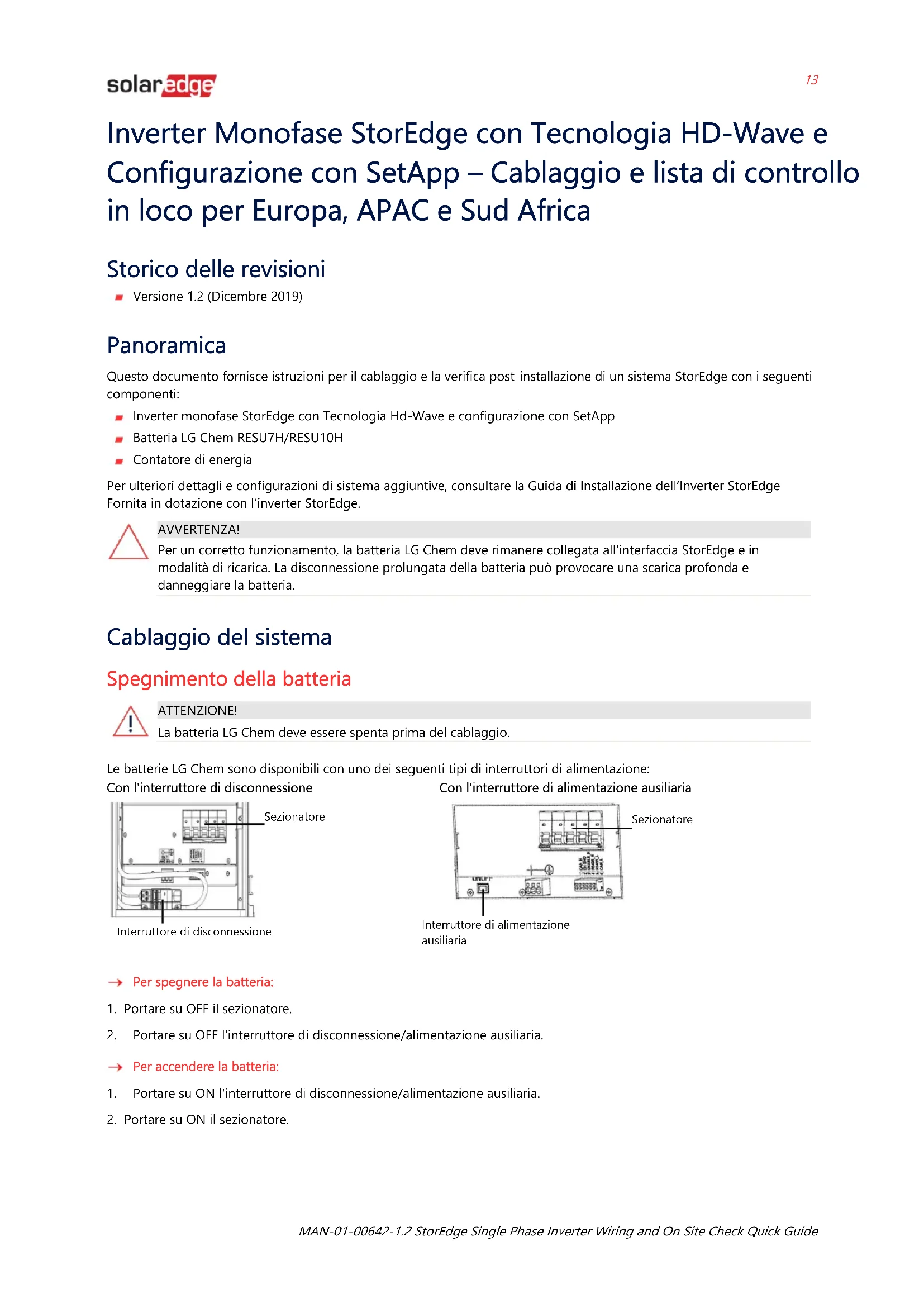 AVVERTENZA! Per un corretto funzionamento, la batteria LG Chem deve rimanere collegata all'interfaccia StorEdge e in modalità di ricarica. La disconnessione prolungata della batteria può provocare una scarica profonda e danneggiare la batteria. Cablaggio del sistema Spegnimento della batteria