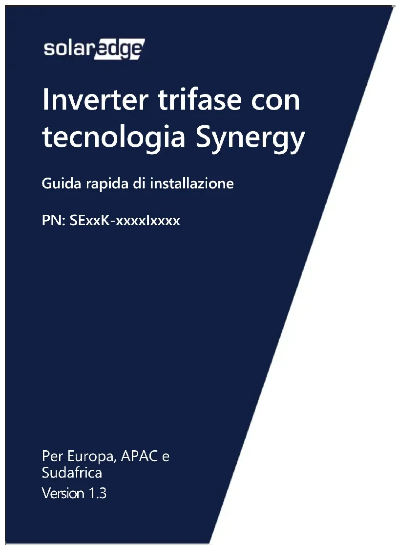 Signification des voyants 18Coordonnées de l'assistance technique: Si vous rencontrez des problèmes techniques concernant les produits SolarEdge, veuillez nous contacter: https://www.solaredge.com/service/support Sujet à changement sans préavis. Copyright © SolarEdge Inc. Tous droits réservés. Mars 2021.Inverter trifase con tecnologia Synergy Guida rapida di installazione PN: SExxK-xxxxIxxxx Per Europa, APAC e Sudafrica Version 1.3NOTA Questo simbolo indica delle informazioni volte ad aiutare l'utente nel fare un uso ottimale del prodotto. Questo simbolo appare sui punti di messa a terra indicati nei manuali e nelle apparecchiature SolarEdge. ATTENZIONE! Indica un rischio. Richiama l'attenzione su una procedura che, se non eseguita correttamente o rispettata, potrebbe provocare danni o distruzione del prodotto. Non ignorare i messaggi di attenzione finché le condizioni indicate non siano state perfettamente comprese e rispettate. Portare su ON/OFF il sezionatore CA principale e attendere 5 minuti AVVERTENZA! Indica un rischio. Richiama l'attenzione su una procedura che, se non eseguita correttamente o rispettata, potrebbe provocare lesioni anche fatali. Non procedere oltre un'avvertenza finché le condizioni indicate non siano state perfettamente comprese e rispettate. Portare su ON/OFF il sezionatore di sicurezza CC sul Synergy Manager e attendere 5 minuti (Applicabile solo per i modelli con sezionatore di sicurezza CC) Non tagliare i connettori dei cavi