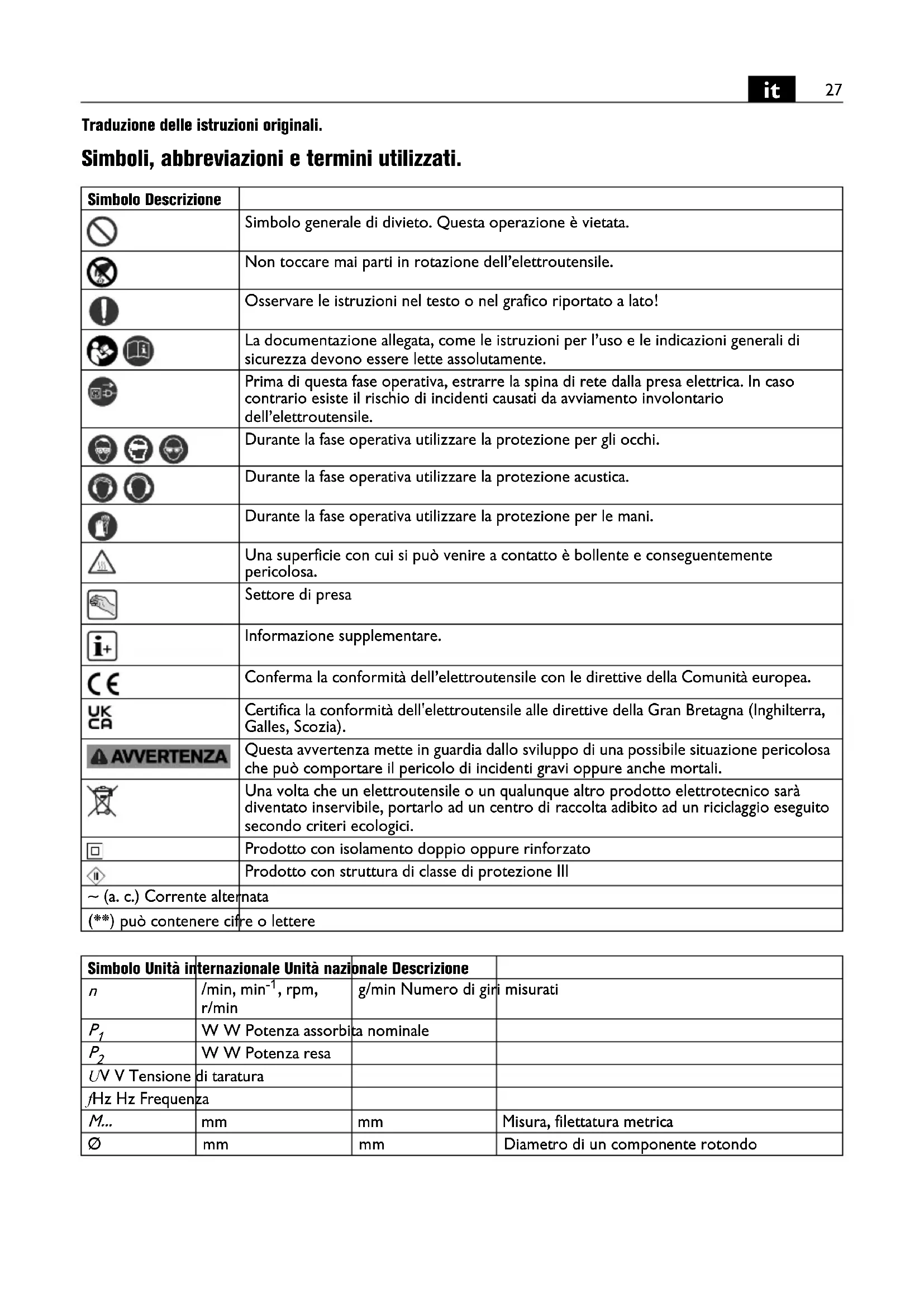 Traduzione delle istruzioni originali. Simboli, abbreviazioni e termini utilizzati. Simbolo Descrizione Simbolo generale di divieto. Questa operazione è vietata. Non toccare mai parti in rotazione dell’elettroutensile. Osservare le istruzioni nel testo o nel grafico riportato a lato! La documentazione allegata, come le istruzioni per l’uso e le indicazioni generali di sicurezza devono essere lette assolutamente. Prima di questa fase operativa, estrarre la spina di rete dalla presa elettrica. In caso contrario esiste il rischio di incidenti causati da avviamento involontario dell’elettroutensile. Durante la fase operativa utilizzare la protezione per gli occhi. Durante la fase operativa utilizzare la protezione acustica. Durante la fase operativa utilizzare la protezione per le mani. Una superficie con cui si può venire a contatto è bollente e conseguentemente pericolosa. Settore di presa Informazione supplementare. Conferma la conformità dell’elettroutensile con le direttive della Comunità europea. Certifica la conformità dell'elettroutensile alle direttive della Gran Bretagna (Inghilterra, Galles, Scozia). Questa avvertenza mette in guardia dallo sviluppo di una possibile situazione pericolosa che può comportare il pericolo di incidenti gravi oppure anche mortali. Una volta che un elettroutensile o un qualunque altro prodotto elettrotecnico sarà diventato inservibile, portarlo ad un centro di raccolta adibito ad un riciclaggio eseguito secondo criteri ecologici. Prodotto con isolamento doppio oppure rinforzato Prodotto con struttura di classe di protezione III ~ (a. c.) Corrente alternata (**) può contenere cifre o lettere Simbolo Unità internazionale Unità nazionale Descrizione