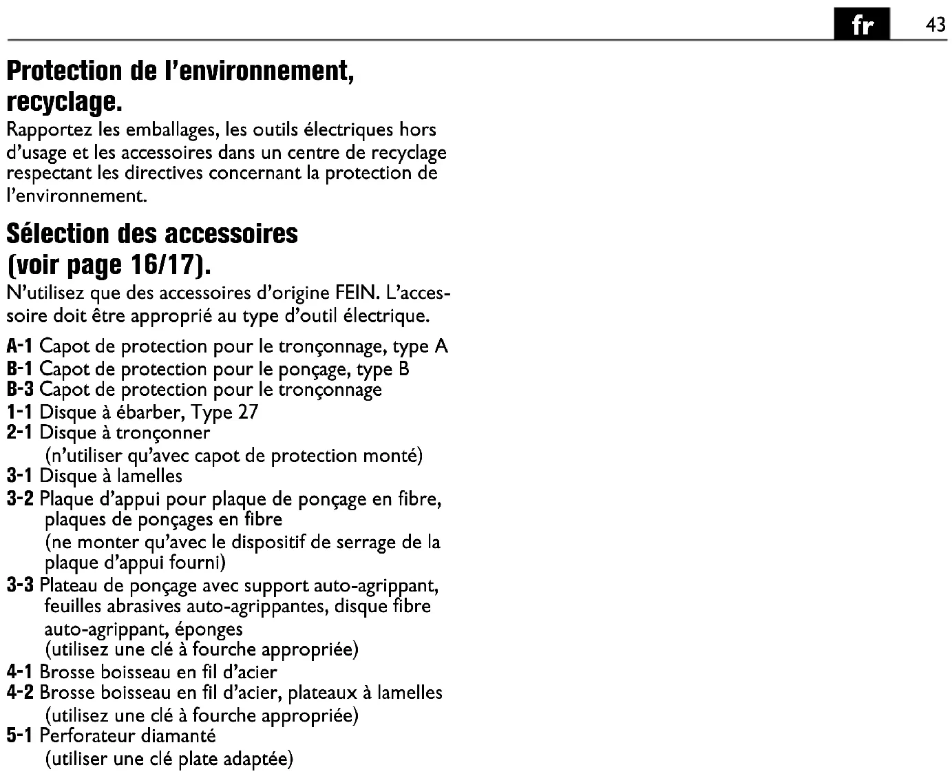 L’attuale lista dei pezzi di ricambio del presente elet- troutensile è presente in Internet sul sito www.fein.com. Utilizzare esclusivamente parti di ricambio originali. In caso di necessità è possibile sostituire da soli le seguenti parti: Accessori, impugnatura supplementare, flangia di ser- raggio, cuffia di protezione, protezione mano Responsabilità per vizi e garanzia. La prestazione di garanzia sul prodotto è valida secondo la relativa normativa vigente nel Paese in cui avviene l’immissione sul mercato. Inoltre la FEIN riconosce la garanzia conformemente alla dichiarazione di garanzia produttore FEIN. Nel modello di fornitura del Vostro elettroutensile può essere contenuta anche solo una parte degli accessori descritti o illustrati nelle presenti istruzioni per l’uso. Dichiarazione di conformità. La dichiarazione CE è valida esclusivamente per i Paesi dell'Unione Europea e dell'EFTA (European Free Trade Association) e solamente per i prodotti destinati al mer- cato UE o EFTA. Dopo l'immissione sul mercato UE del prodotto, il contrassegno UKCA perde la sua validità. La dichiarazione UKCA è valida esclusivamente per il mercato britannico (Inghilterra, Galles e Scozia) e solo per prodotti destinati al mercato britannico. Dopo l'immissione sul mercato britannico del prodotto, il contrassegno CE perde la sua validità. Misure ecologiche, smaltimento. Portare ad un centro di raccolta adibito ad un riciclaggio eseguito secondo criteri ecologici gli imballaggi, gli elet- troutensili e gli accessori scartati. Selezione degli accessori (vedi pagina 16/17). Utilizzare esclusivamente accessori originali FEIN. L’accessorio deve essere adatto al tipo dell’elettrouten- sile. A-1 Cuffia di protezione per la troncatura, tipo A B-1 Cuffia di protezione per la levigatura, tipo B B-3 Copertura di protezione per la troncatura 1-1 Mola da sbavo, tipo 27 2-1 Disco da taglio (utilizzare esclusivamente con copertura di prote- zione montata) 3-1 Platorello abrasivo lamellare 3-2 Disco di sostegno per dischi abrasivi in fibra, dischi abrasivi in fibra (montare esclusivamente con flangia di serraggio disco di sostegno fornita in dotazione) 3-3 Platorello con velcro, fogli abrasivi con fissaggio rapido, feltro di satinatura con fissaggio rapido a strappo, spugne per lucidatura (utilizzare una chiave fissa adatta) 4-1 Spazzola conica in acciaio 4-2 Spazzola a tazza in acciaio, ruote abrasive lamellari (utilizzare una chiave fissa adatta) 5-1 Punta per fori diamantata (utilizzare una chiave fissa adatta)53