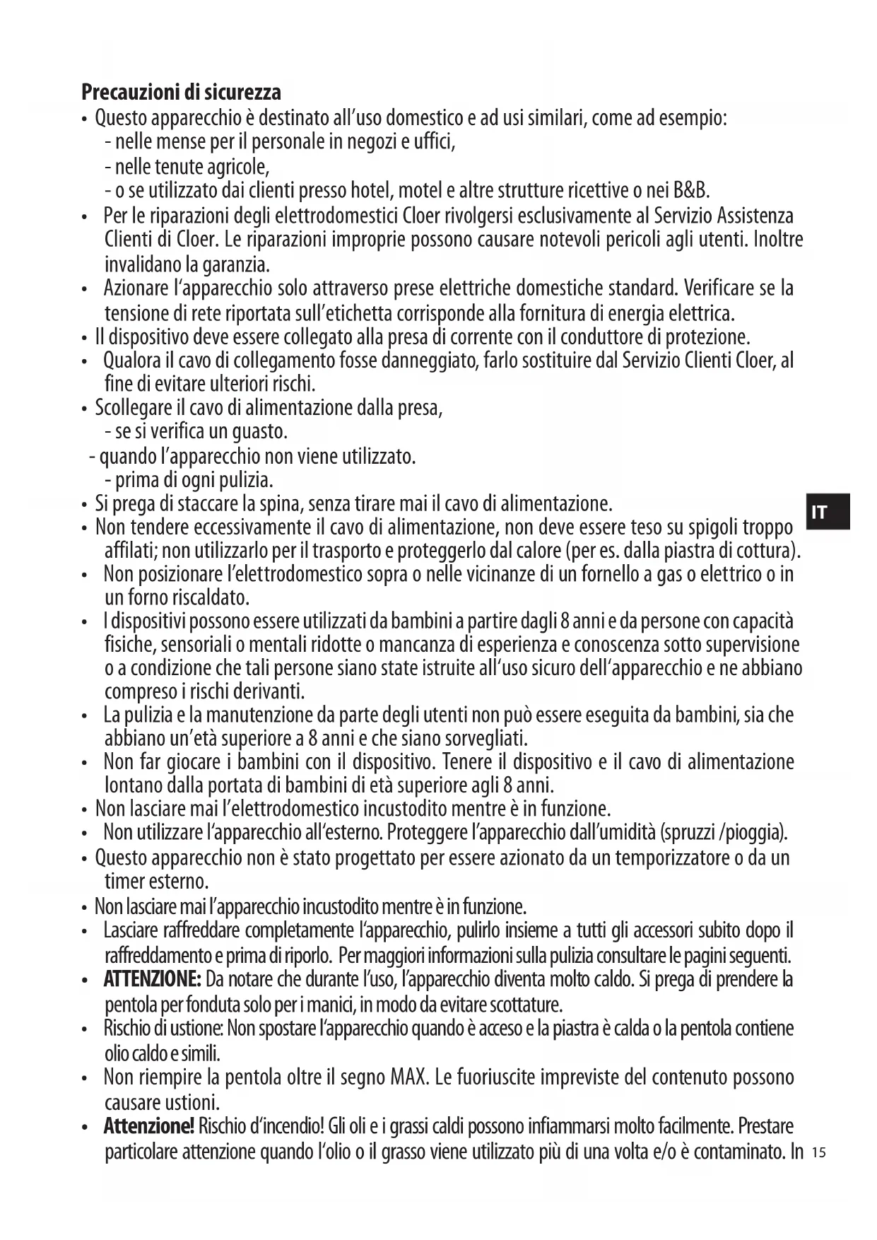 - Per le riparazioni degli elettrodomestici Cloer rivolgersi esclusivamente al Servizio Assistenza Clienti di Cloer. Le riparazioni improprie possono causare notevoli pericoli agli utenti. Inoltre invalidano la garanzia.