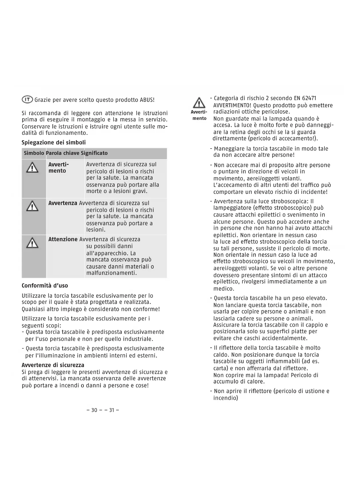 openen sluiten– 28 – – 29 – Conformiteitsverklaring Hiermee verklaart ABUS August Bremicker Söhne KG, dat de zaklamp TL-525 bij beoogd gebruik in overeenstemming is met de essentiële eisen en overige geldende bepalingen van de richtlijnen 2014/30/EU en 2011/65/EU. De volledige tekst van de EU-conformiteitsverklaring kan worden aangevraagd op: info@abus.de. Afvoer Voer de verpakking gesorteerd af. Karton behoort bij het oud papier, folies en plastic onderdelen bij de recyclebare materialen. Voer het apparaat af zoals beschreven in de EG-richt- lijn 2002/96/EG betreende afgedankte elektrische en elektronische apparatuur – WEEE (Waste Electrical and Electronic Equipment). Bij vragen wendt u zich tot de voor de afvoer bevoegde gemeentelijke dienst. Infor- matie over verzamelpunten voor afgedankte apparatu- ur krijgt u bij de gemeente, regionale afvalbedrijven of bij uw verkoper. Voer batterijen nooit af als huishoudelijke afval. Garantie ABUS producten zijn met de grootste zorgvuldigheid ontworpen, geproduceerd en op basis van de geldende voorschrien getest. De garantie hee uitsluitend betrekking op gebreken die op materiaal- of fabrieksfouten duiden op het moment van verkoop. Bij bewijs van een materiaal- of fabrieksfout wordt de product na beoordeling van de garantiegever gerepareerd of vervangen. De garantie eindigt in dit geval met het aopen van de oorspronkelijke garantieperiode. Verdergaande aanspraken zijn uitdrukkelijk uitgesloten. ABUS is niet aansprakelijk voor gebreken en schade die zijn veroorzaakt door inwerkingen van buitenaf (bijvoorbeeld door transport, inwerking van geweld), onjuist gebruik, normale slijtage of het niet in acht nemen van deze handleiding. Bij het indienen van een garantieclaim moet bij de product het originele WEEE-Reg.-Nr. DE79663011 aankoopbewijs met datum van de aankoop en een korte schrielijke beschrijving van de fout worden gevoegd. Technische wijzigingen voorbehouden. Geen aansprakelijkheid voor vergissingen en drukfouten. © ABUS 2020 ABUS August Bremicker Söhne KG D 58292 Wetter | Germany. Tel.: +49 (0) 23 35 63 40 |– 30 – – 31 – Grazie per avere scelto questo prodotto ABUS! Si raccomanda di leggere con attenzione le istruzioni prima di eseguire il montaggio e la messa in servizio. Conservare le istruzioni e istruire ogni utente sulle mo- dalità di funzionamento. Simbolo Parola chiave Significato Avverti- mento Avvertenza di sicurezza sul pericolo di lesioni o rischi per la salute. La mancata osservanza può portare alla morte o a lesioni gravi. Avvertenza Avvertenza di sicurezza sul pericolo di lesioni o rischi per la salute. La mancata osservanza può portare a lesioni. Attenzione Avvertenza di sicurezza su possibili danni all'apparecchio. La mancata osservanza può causare danni materiali o malfunzionamenti. Spiegazione dei simboli Conformità d’uso Utilizzare la torcia tascabile esclusivamente per lo scopo per il quale è stata progettata e realizzata. Qualsiasi altro impiego è considerato non conforme! Utilizzare la torcia tascabile esclusivamente per i seguenti scopi: - Questa torcia tascabile è predisposta esclusivamente per l'uso personale e non per quello industriale. - Questa torcia tascabile è predisposta esclusivamente per l'illuminazione in ambienti interni ed esterni. Avvertenze di sicurezza Si prega di leggere le presenti avvertenze di sicurezza e di attenervisi. La mancata osservanza delle avvertenze può portare a incendi o danni a persone e cose! - Categoria di rischio 2 secondo EN 62471 AVVERTIMENTO! Questo prodotto può emettere radiazioni ottiche pericolose. Non guardate mai la lampada quando è accesa. La luce è molto forte e può danneggi- are la retina degli occhi se la si guarda direttamente (pericolo di accecamento!). - Maneggiare la torcia tascabile in modo tale da non accecare altre persone! - Non accecare mai di proposito altre persone o puntare in direzione di veicoli in movimento, aerei/oggetti volanti. L’accecamento di altri utenti del traco può comportare un elevato rischio di incidente! - Avvertenza sulla luce stroboscopica: Il lampeggiatore (eetto stroboscopico) può causare attacchi epilettici o svenimento in alcune persone. Questo può accedere anche in persone che non hanno hai avuto attacchi epilettici. Non orientare in nessun caso la luce ad eetto stroboscopico della torcia su tali persone, sussiste il pericolo di morte. Non orientale in nessun caso la luce ad eetto stroboscopico su veicoli in movimento, aerei/oggetti volanti. Se voi o altre persone dovessero presentare sintomi di un attacco epilettico, rivolgersi immediatamente a un medico. - Questa torcia tascabile ha un peso elevato. Non lanciare questa torcia tascabile, non usarla per colpire persone o animali e non lasciarla cadere su persone o animali. Assicurare la torcia tascabile con il cappio e posizionarla solo su superci piatte per evitare che caschi accidentalmente. - Il riettore della torcia tascabile è molto caldo. Non posizionare dunque la torcia tascabile su oggetti inammabili (ad es. carta) e non aerrarla dal riettore. Non coprire mai la lampada! Pericolo di accumulo di calore. - Non aprire il riettore (pericolo di ustione e incendio) Avverti- mento– 32 – – 33 – - Non utilizzare la torcia tascabile sotto l'acqua. - L'imballaggio deve essere tenuto lontano dalla portata dei bambini. Rischio di soocamento! - Le batterie devono essere tenute fuori dalla portata dei bambini. Sussiste il rischio che i bambini mettano in bocca le batterie e le ingeriscano. Questo può causare gravi danni alla salute. In questo caso contattare immediatamente un medico! - Qualora le batterie presentino delle perdite o siano danneggiate, sussiste il pericolo di lesioni alla pelle e agli occhi. In questo caso, indossare guanti protettivi adatti e pulire il vano batterie con un panno asciutto. - Le batterie non devono essere smontate, bucate, danneggiate, mandate in corto- circuito, riscaldate o gettate nel fuoco (rischio di esplos