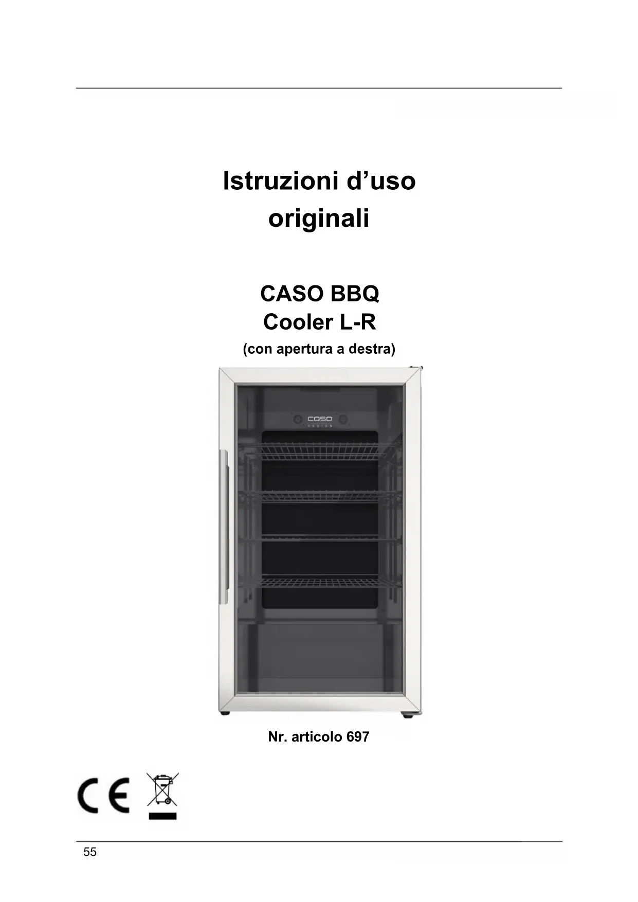 Istruzioni d’uso originali CASO BBQ Cooler L-R (con apertura a destra) Nr. articolo 69756 31 Istruzioni d´uso: In generale Legga le informazioni qui contenute, affinché acquisti rapidamente familiarità con il suo apparecchio e affinché possa utilizzare appieno le sue funzioni. Il Suo l´apparecchio Le renderà un buon servizio per molti anni, se lo tratterà e lo curerà in modo adeguato. Ci auguriamo che il suo utilizzo Le procuri molta gioia.