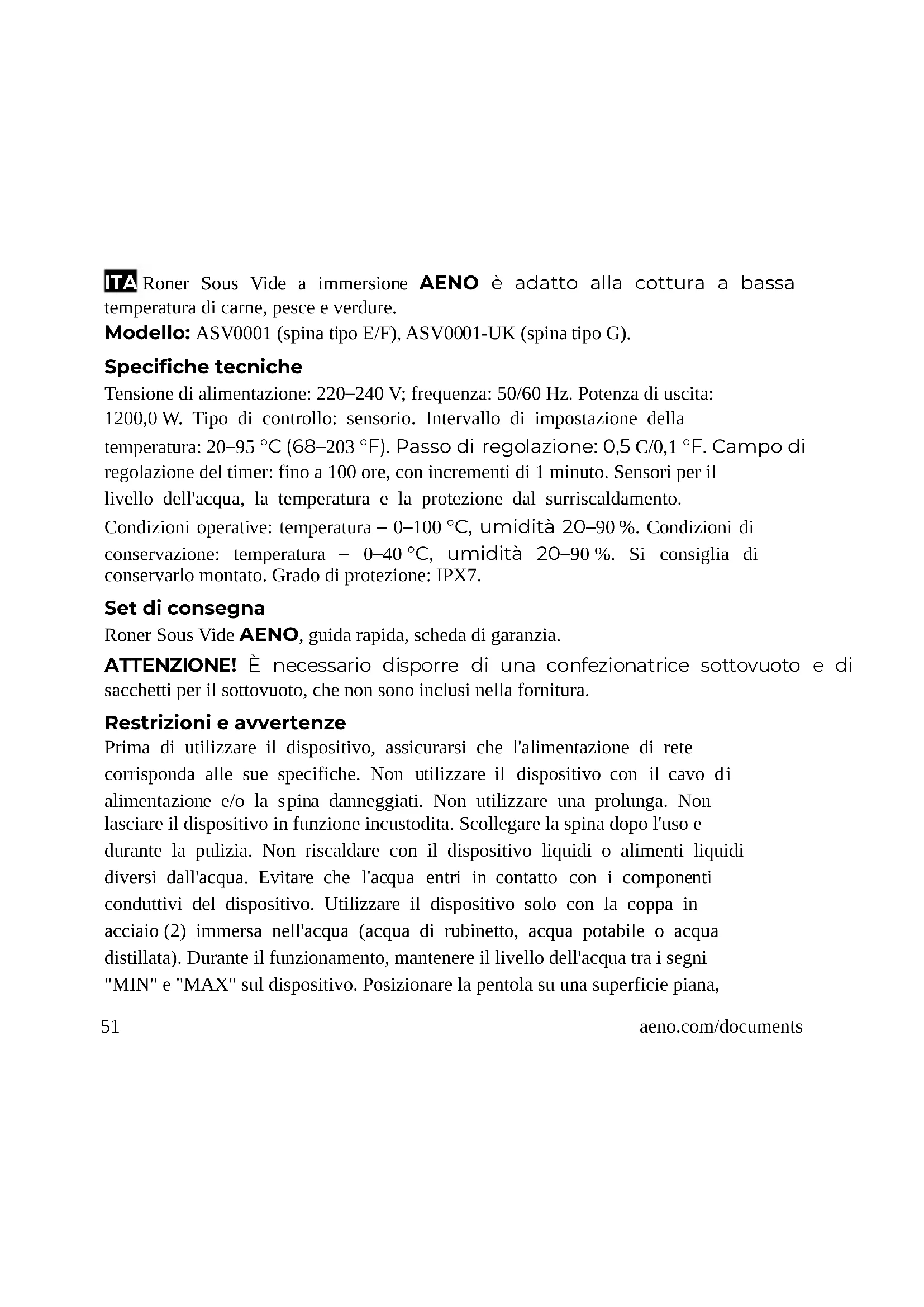 ITA Roner Sous Vide a immersione AENO è adatto alla cottura a bassa temperatura di carne, pesce e verdure. Modello: ASV0001 (spina tipo E/F), ASV0001-UK (spina tipo G). Specifiche tecniche Tensione di alimentazione: 220–240 V; frequenza: 50/60 Hz. Potenza di uscita: 1200,0 W. Tipo di controllo: sensorio. Intervallo di impostazione della temperatura: 20–95 °C (68–203 °F). Passo di regolazione: 0,5 C/0,1 °F. Campo di regolazione del timer: fino a 100 ore, con incrementi di 1 minuto. Sensori per il livello dell'acqua, la temperatura e la protezione dal surriscaldamento. Condizioni operative: temperatura – 0–100 °C, umidità 20–90 %. Condizioni di conservazione: temperatura – 0–40 °C, umidità 20–90 %. Si consiglia di conservarlo montato. Grado di protezione: IPX7. Set di consegna Roner Sous Vide AENO, guida rapida, scheda di garanzia. ATTENZIONE! È necessario disporre di una confezionatrice sottovuoto e di sacchetti per il sottovuoto, che non sono inclusi nella fornitura. Restrizioni e avvertenze Prima di utilizzare il dispositivo, assicurarsi che l'alimentazione di rete corrisponda alle sue specifiche. Non utilizzare il dispositivo con il cavo di alimentazione e/o la spina danneggiati. Non utilizzare una prolunga. Non lasciare il dispositivo in funzione incustodita. Scollegare la spina dopo l'uso e durante la pulizia. Non riscaldare con il dispositivo liquidi o alimenti liquidi diversi dall'acqua. Evitare che l'acqua entri in contatto con i componenti conduttivi del dispositivo. Utilizzare il dispositivo solo con la coppa in acciaio (2) immersa nell'acqua (acqua di rubinetto, acqua potabile o acqua distillata). Durante il funzionamento, mantenere il livello dell'acqua tra i segni "MIN" e "MAX" sul dispositivo. Posizionare la pentola su una superficie piana,aeno.com/documents