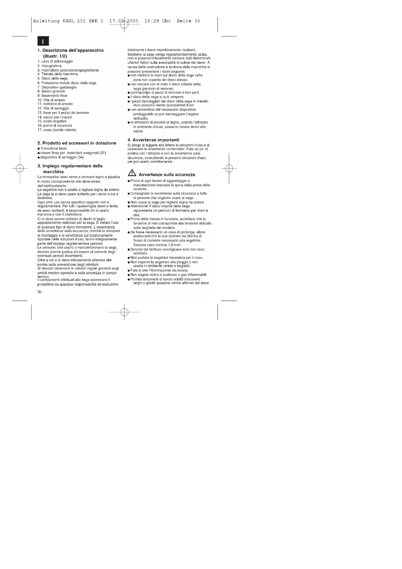 Servirsi del tamburo avvolgicavo solo con cavo srotolato. Non portare la segatrice tenendola per il cavo. Non esporre la segatrice alla pioggia e non usarla in ambiente umido o bagnato. Fate si che l’illuminazione sia buona. Non segate vicino a sostanze o gas infiammabili. Portate indumenti di lavoro adatti! Indumenti larghi o gioielli possono venire afferrati dal disco Anleitung KGSL 251 SPK 1 17.03.2005 10:29 Uhr Seite 30I