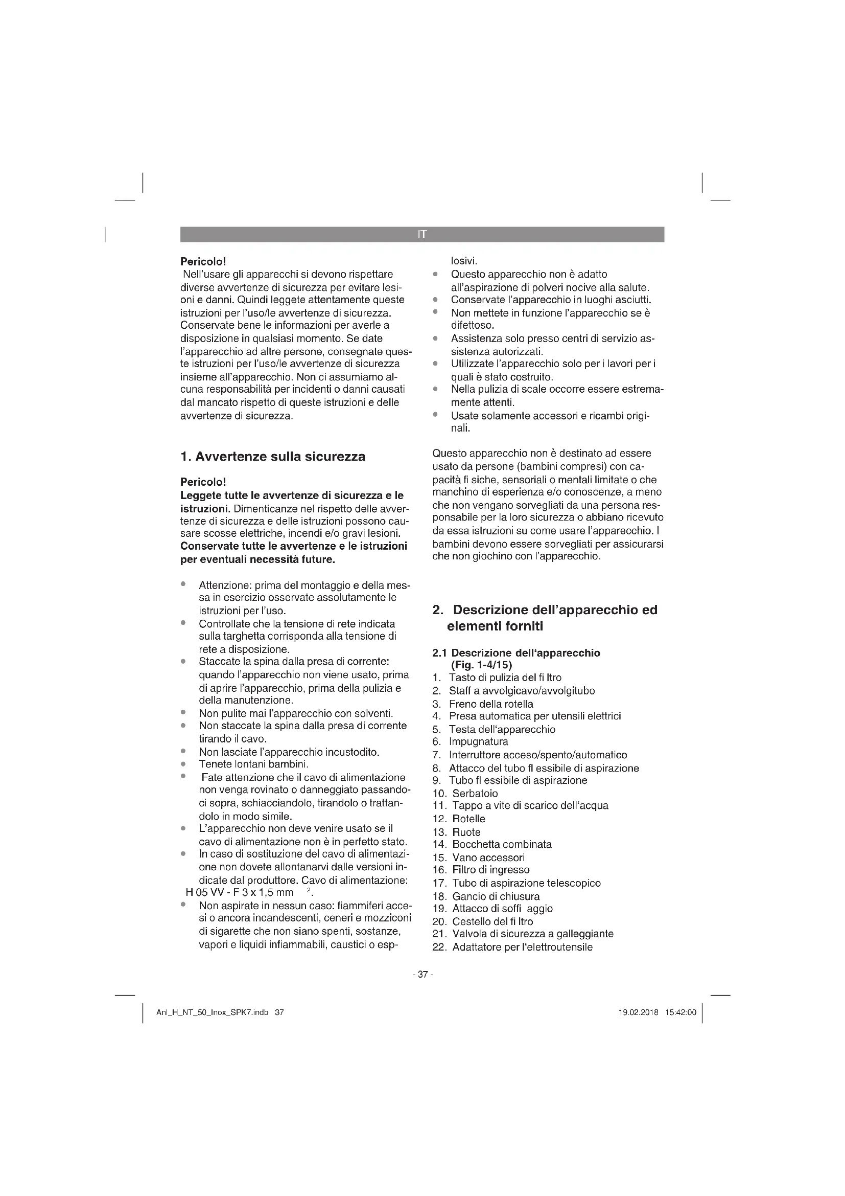 Questo apparecchio non è adatto all’aspirazione di polveri nocive alla salute.