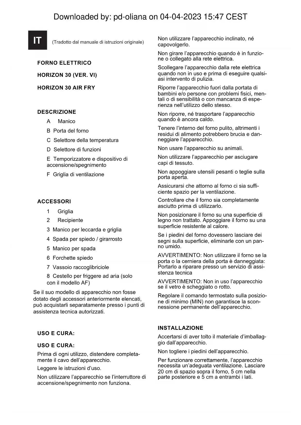 DESCRIZIONE A Manico B Porta del forno C Selettore della temperatura D Selettore di funzioni E Temporizzatore e dispositivo di accensione/spegnimento F Griglia di ventilazione ACCESSORI 1 Griglia 2 Recipiente 3 Manico per leccarda e griglia 4 Spada per spiedo / girarrosto 5 Manico per spada 6 Forchette spiedo 7 Vassoio raccoglibriciole 8 Cestello per friggere ad aria (solo con il modello AF) Se il suo modello di apparecchio non fosse dotato degli accessori anteriormente elencati, può acquistarli separatamente presso i punti di assistenza tecnica autorizzati. USO E CURA: USO E CURA: Prima di ogni utilizzo, distendere completa- mente il cavo dell’apparecchio. Leggere le istruzioni d’uso. Non utilizzare l’apparecchio se l’interruttore di accensione/spegnimento non funziona. Non utilizzare l’apparecchio inclinato, né capovolgerlo. Non girare l’apparecchio quando è in funzio- ne o collegato alla rete elettrica. Scollegare l’apparecchio dalla rete elettrica quando non in uso e prima di eseguire qualsi- asi intervento di pulizia. Riporre l’apparecchio fuori dalla portata di bambini e/o persone con problemi sici, men- tali o di sensibilità o con mancanza di espe- rienza nell’utilizzo dello stesso. Non riporre, né trasportare l’apparecchio quando è ancora caldo. Tenere l’interno del forno pulito, altrimenti i residui di alimento potrebbero brucia e dan- neggiare l’apparecchio. Non usare l’apparecchio su animali. Non utilizzare l’apparecchio per asciugare capi di tessuto. Non appoggiare utensili pesanti o teglie sulla porta aperta. Assicurarsi che attorno al forno ci sia su- ciente spazio per la ventilazione. Controllare che il forno sia completamente asciutto prima di utilizzarlo. Non posizionare il forno su una supercie di legno non trattato. Appoggiare il forno su una supercie resistente al calore. Se i piedini del forno dovessero lasciare dei segni sulla supercie, eliminarle con un pan- no umido. AVVERTIMENTO: Non utilizzare il forno se la porta o la cerniera della porta è danneggiata: Portarlo a riparare presso un servizio di assi- stenza tecnica AVVERTIMENTO: Non in uso l’apparecchio se il vetro è scheggiato o rotto. Regolare il comando termostato sulla posizio- ne di minimo (MIN) non garantisce la scon- nessione permanente dell’apparecchio. INSTALLAZIONE Accertarsi di aver tolto il materiale d’imballag- gio dall’apparecchio. Non togliere i piedini dell’apparecchio. Per funzionare correttamente, l’apparecchio necessita un’adeguata ventilazione. Lasciare 20 cm di spazio sopra il forno, 5 cm nella parte posteriore e 5 cm a entrambi i lati. IT (Tradotto dal manuale di istruzioni originale) Downloaded by: pd-oliana on 04-04-2023 15:47 CESTISTRUZIONI D’USO