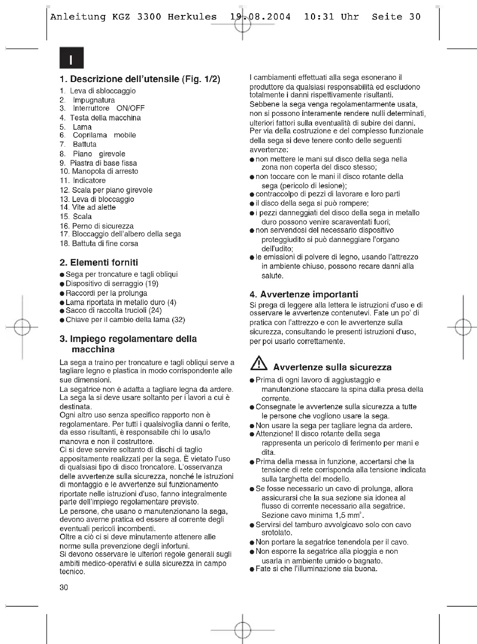 Servirsi del tamburo avvolgicavo solo con cavo srotolato. Non portare la segatrice tenendola per il cavo. Non esporre la segatrice alla pioggia e non usarla in ambiente umido o bagnato. Fate si che l’illuminazione sia buona. Anleitung KGZ 3300 Herkules 19.08.2004 10:31 Uhr Seite 30I