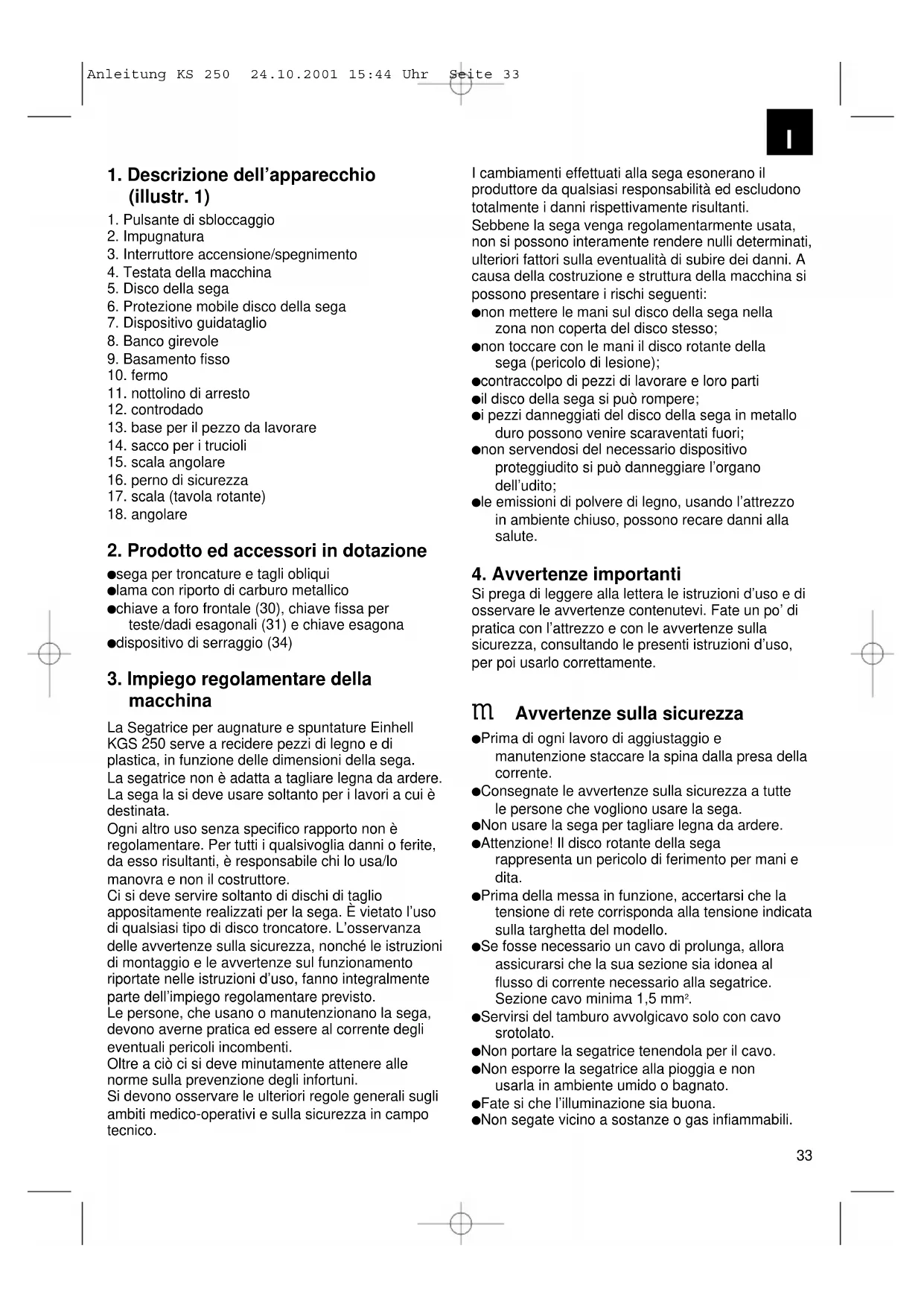 Anleitung KS 250 24.10.2001 15:44 Uhr Seite 3334 Portate indumenti di lavoro adatti! Indumenti larghi o gioielli possono venire afferrati dal disco rotante della sega. La persona che l’usa deve avere almeno 18 anni di età. Apprendisti almeno 16 anni, però sotto sorveglianza. Tenere lontani i bambini dall’attrezzo allacciato alla rete elettrica. Controllare lo stato del conduttore di collega- mento alla rete elettrica. Non servirsi di conduttori di collegamento difettosi o danneggiati. Tenere libero il posto di lavoro da ritagli di legno e da altri pezzi sparsi intorno. Non si devono distrarre le persone che stanno usando l’attrezzo. Tenete conto della direzione rotatoria del motore e del disco della sega. Non si deve per nessun motivo frenare il disco della sega facendovi contro lateralmente, dopo aver spento il motore. Installarvi solo dischi per sega ben affilati, senza screpolature e deformazioni. Sull’attrezzo si devono impiegare soltanto utensili rispondenti alla prEN 847-1:1996. I dischi della sega difettosi li si deve immedia- tamente ricambiare. Non usare dischi per sega i di cui dati non corrispondono a quelli specificati nelle presenti modalità d’impiego. Ci si deve assicurare che la freccia sul disco della sega corrisponda a quella riportata sull’attrezzo. Staccare la spina dalla presa di corrente e verificare, portando con la mano il disco stesso nelle posizioni a 45° e a 90°, che il disco della sega non tocchi il banco girevole in nessuna posizione di lavoro. Se necessario, riaggiustare la testa della segatrice come indicato nel punto C/F. Ci si deve assicurare che tutti i dispositivi, che coprono il disco della sega, funzionino perfettamente. Il tettuccio di protezione mobile non lo si deve bloccare dopo averlo aperto. I dispositivi di sicurezza dell’attrezzo non li si deve né smontare e né renderli inservibili. I dispositivi di protezione danneggiati o difettosi li si deve immediatamente ricambiare. Non tagliare pezzi da sottoporre a lavorazione troppo corti ed accertarsi che si possano tenere bene in mano. Evitate di porre le mani in luoghi instabili, dove ci si può ferire, scivolando con una o entrambi le mani, toccando il disco della sega rotante. Se i pezzi in lavorazione fossero lunghi, allora sarà necessario un piano d’appoggio addizionale (tavolo, cavalletti ecc.), per evitare che la segatrice si capovolga. I pezzi in lavorazione rotondi, quali p.es. stanghe di tasselli ecc., devono venire bloccati con organo adatto. Nelle parti da recidere dei pezzi in lavorazione non si devono trovare chiodi o ulteriori corpi estranei. Operare trovandosi sempre a lato del disco della sega. Non sovraccaricare la sega fino a farla fermare completamente. Premere sempre il pezzo in lavorazione debitamente contro il piano di lavoro e contro il dispositivo guidataglio, per evitare che il pezzo in lavorazione vacilli o si giri. Verificate che i ritagli si stacchino sul lato del disco della sega. In caso contrario questi potrebbero venire afferrati dal disco della sega e scaraventati via. Non segate mai contemporaneamente due o più pezzi da lavorare. Non allontanate mai schegge, segatura o pezzi di legno eventualmente incastratisi nel disco della sega rotante. Per eliminare inconvenienti tecnici o per allontanare pezzi di legno incastratisi, spegnere la segatrice e staccare la spina. Adattare la segatrice ad altri lavori ed effettuare lavori di regolazione, rilevamento e pulizia solo dopo aver spento il motore ed aver staccato la spina. Prima dell’avviamento verificare che siano stati allontanati chiavi e utensili d’aggiustaggio. Allontanandosi dal posto di lavoro, spegnere il motore e staccare la spina. Installazioni elettriche, riparazioni e lavori di manutenzione devono essere eseguiti soltanto da specialisti. Tutti i dispositivi di protezione e sicurezza devono essere rimontati, subito dopo avere terminato gl’interventi di riparazione e manutenzione. Si devono osservare le avvertenze del costruttore sulla sicurezza, sull’uso e sulla manutenzione, nonché le dimensioni specificate nei „Dati tecnici“. Si devono osservare le pertinenti norme sulla prevenzione degli infortuni, nonché le ulteriori regole sulla sicurezza in campo tecnico generalmente riconosciute. Si devono osservare le istruzioni riportate negli opuscoli informativi delle associazioni professionali di categoria (VGB 7). Volendo effettuare un qualsivoglia lavoro di taglio, collegare la segatrice ad un dispositivo d’aspirazione.