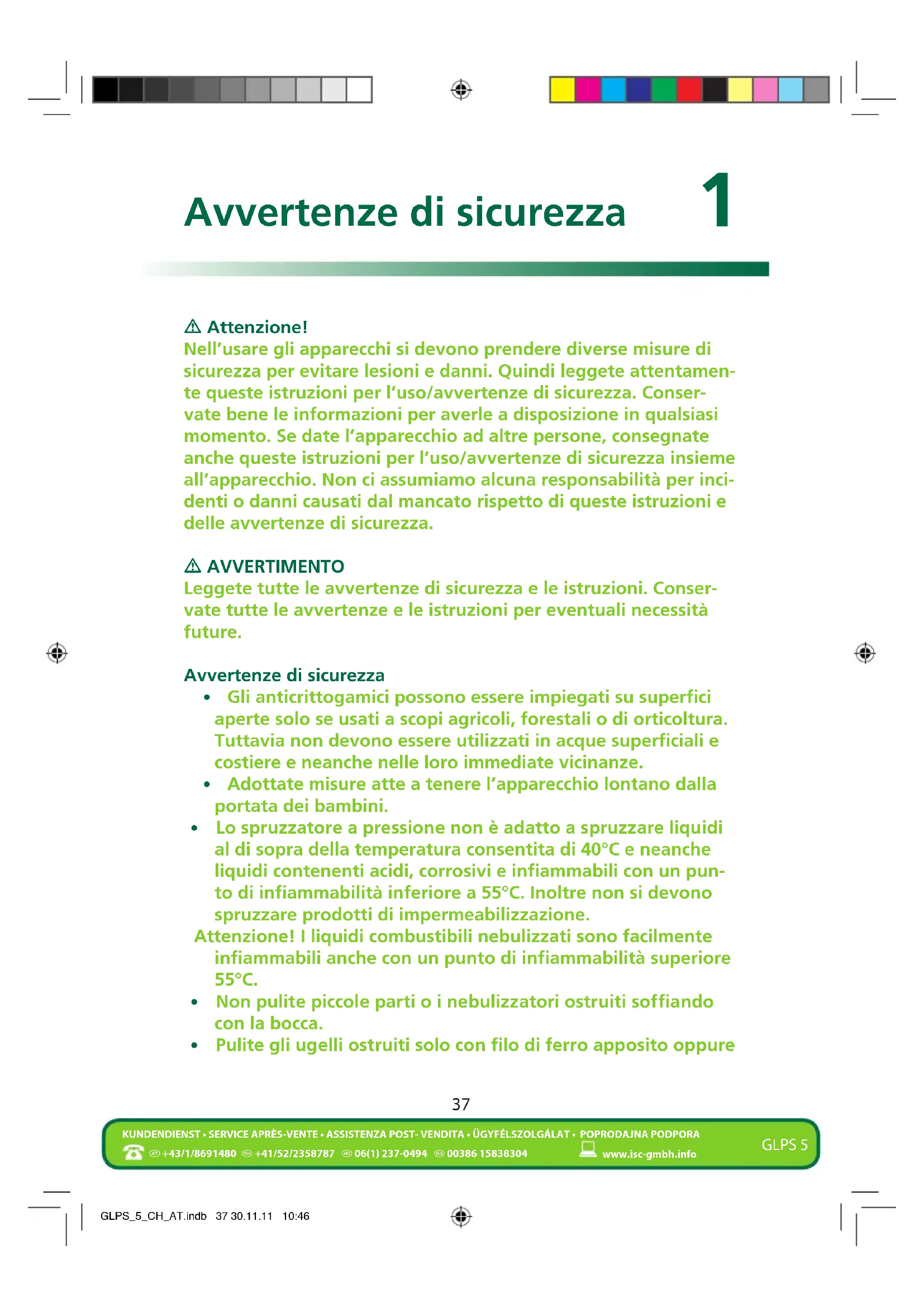 +43/1/8691480 +41/52/2358787 06(1) 237-0494 00386 15838304KUNDENDIENST • SERVICE APRÈS-VENTE • ASSISTENZA POST- VENDITA • ÜGYFÉLSZOLGÁLAT • POPRODAJNA PODPORAwww.isc-gmbh.info GLPS 5 Il periodo di garanzia ha una durata di 3 anni e inizia il giorno dell‘acquisto o della consegna della merce. Perché i diritti di garanzia abbiano validità è assolutamente necessario presentare lo scontri-no relativo all‘Sacquisto e riempire la scheda della garanzia. Conservare quindi sia lo scontrino che la scheda della garanzia!Il produttore garantisce la risoluzione gratuita di casi di mancanze riconducibili a difetti di materiale o di fabbricazione attraverso la riparazione, la sostituzione o il rimborso, a discrezione del produtto-re stesso. La garanzia non si estende a danni causati da incidenti, eventi imprevisti (problemi causati da fulmini, acqua, fuoco ecc.), uso o trasporto non conforme, mancato rispetto delle prescrizioni di sicurezza e/o di manutenzione o da altro tipo di uso o modifiche diversi da quelli conformi. Il periodo di garanzia per i componenti soggetti ad usura e le parti di consumo in caso di utiliz-zo normale e conforme (ad es. lampade, batterie, pneumatici etc.) dura 6 mesi. Le conseguenze dell’utilizzo quotidiano (graffi, ammaccamenti) non sono coperte da garanzia. L‘obbligo di garanzia da parte del rivenditore stabilito per legge non viene limitato dalla presente garanzia. Il periodo di garanzia può essere esteso soltanto se una norma di legge lo prevede. Nei paesi nei quali la legge prescrive una garanzia (obbligatoria) e/o una disponibilità a magazzino di ricambi e/o una regolamentazione per il rimborso dei danni, valgono le condizioni minime stabilite dalla legge. Il servizio assistenza e il rivenditore non sono in alcun modo responsabili in caso di ripa-razione per eventuali dati o impostazioni salvate sul prodotto dall’utente. Anche dopo la scadenza del periodo di garanzia è possibile inviare gli apparecchi difettosi al ser-vizio di assistenza a scopo di riparazione. In questo caso i lavori di riparazione verranno effettuati a pagamento. Nel caso in cui la riparazione o il preventivo non fossero gratuiti, verrà informato in anticipo. Indirizzo(i) assistenza: Einhell Schweiz AG, St. Gallerstrasse 182, CH-8404 Winterthur Numero verde: +41/52/2358787 Denominazione produttore/importatore: ISC GmbH, Eschenweg 6, D-94405 Landau e-mail: info@einhell.ch Denominazione prodotto: Spruzzatore a pressione GLPS 5 Numero identificativo prodotto/produttore: 34.251.65 Numero articolo: 26361 Periodo azione: 04/2012 Azienda e sede del rivenditore: ALDI SUISSE AG, Niederstettenstraße 3, CH-9536 Schwarzenbach SG Descrizione del difetto: ...............................................................................................................................