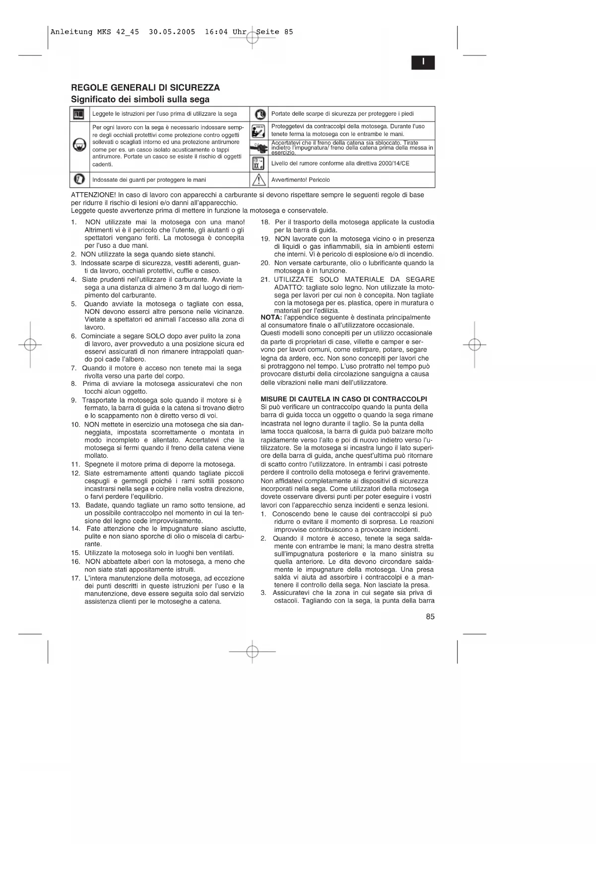 ATTENZIONE! In caso di lavoro con apparecchi a carburante si devono rispettare sempre le seguenti regole di base per ridurre il rischio di lesioni e/o danni all’apparecchio. Leggete queste avvertenze prima di mettere in funzione la motosega e conservatele. Leggete le istruzioni per l’uso prima di utilizzare la sega Per ogni lavoro con la sega è necessario indossare semp- re degli occhiali protettivi come protezione contro oggetti sollevati o scagliati intorno ed una protezione antirumore come per es. un casco isolato acusticamente o tappi antirumore. Portate un casco se esiste il rischio di oggetti cadenti. Proteggetevi da contraccolpi della motosega. Durante l’uso tenete ferma la motosega con le entrambe le mani. Indossate dei guanti per proteggere le mani Portate delle scarpe di sicurezza per proteggere i piedi Livello del rumore conforme alla direttiva 2000/14/CE Avvertimento! Pericolo Accertatevi che il freno della catena sia sbloccato. Tirate indietro l’impugnatura/ freno della catena prima della messa in esercizio. Significato dei simboli sulla sega Anleitung MKS 42_45 30.05.2005 16:04 Uhr Seite 85I