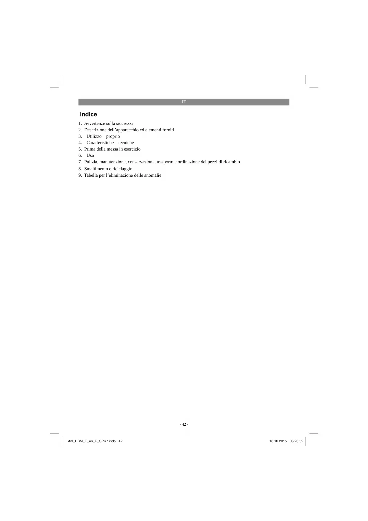 Se possibile, conservate l’imballaggio fino alla scadenza della garanzia. Pericolo! L’apparecchio e il materiale d’imballaggio non sono giocattoli! I bambini non devono giocare con sacchetti di plastica, fi lm e pic- coli pezzi! Sussiste pericolo di ingerimento e soff ocamento! Anl_HBM_E_46_R_SPK7.indb 43Anl_HBM_E_46_R_SPK7.indb 43 16.10.2015 08:26:5216.10.2015 08:26:52IT