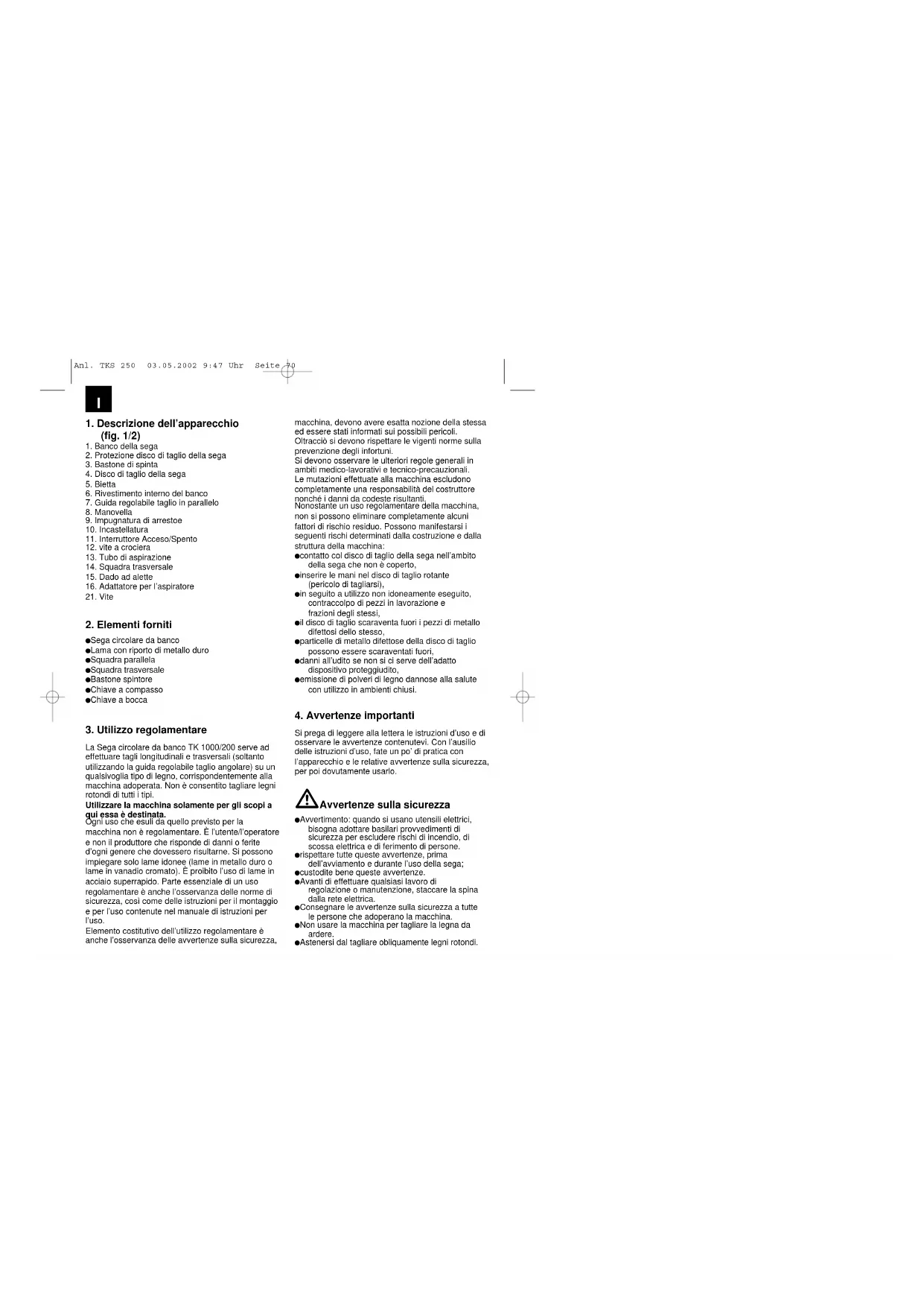 Si prega di leggere alla lettera le istruzioni d’uso e di osservare le avvertenze contenutevi. Con l’ausilio delle istruzioni d’uso, fate un po’ di pratica con l’apparecchio e le relative avvertenze sulla sicurezza, per poi dovutamente usarlo. Avvertenze sulla sicurezza Avvertimento: quando si usano utensili elettrici, bisogna adottare basilari provvedimenti di sicurezza per escludere rischi di incendio, di scossa elettrica e di ferimento di persone. rispettare tutte queste avvertenze, prima dell’avviamento e durante l’uso della sega; custodite bene queste avvertenze. Avanti di effettuare qualsiasi lavoro di regolazione o manutenzione, staccare la spina dalla rete elettrica. Consegnare le avvertenze sulla sicurezza a tutte le persone che adoperano la macchina. Non usare la macchina per tagliare la legna da ardere. Astenersi dal tagliare obliquamente legni rotondi. Anl. TKS 250 03.05.2002 9:47 Uhr Seite 70I La macchina dispone di un interruttore di sicurezza (11) e di anti-riavviamento in seguito a mancanza di tensione. Prima della messa in funzione verificare se la tensione indicata sulla targhetta del modello dell’apparecchio corrisponde a quella della tensione di rete. Se dovesse essere necessaria una prolunga, allora assicurarsi che la sezione della stessa, percorsa dalla corrente necessitata dalla sega, sia sufficiente. Sezione minima richiesta 1 mm