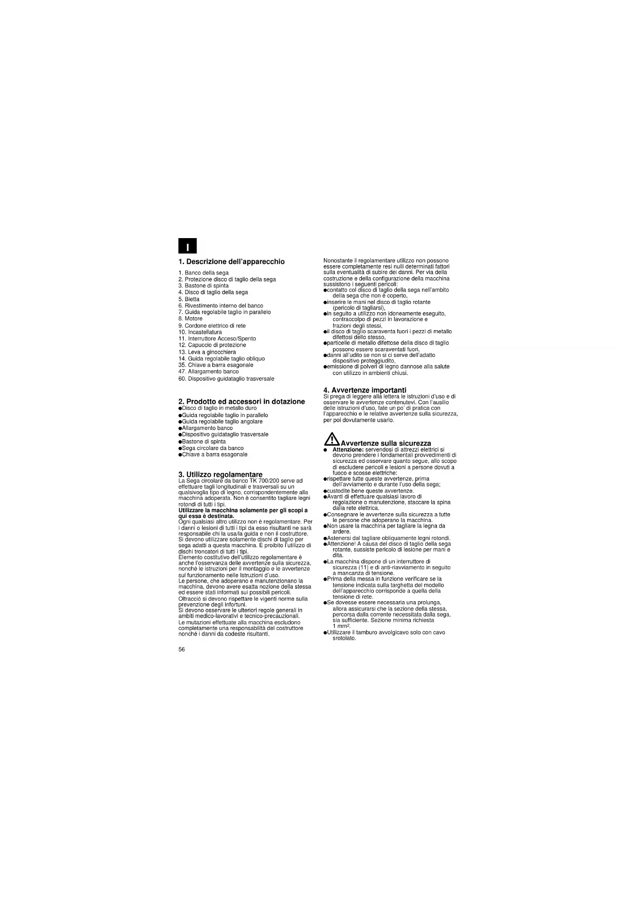 La Sega circolare da banco TK 700/200 serve ad effettuare tagli longitudinali e trasversali su un qualsivoglia tipo di legno, corrispondentemente alla macchina adoperata. Non è consentito tagliare legni rotondi di tutti i tipi. Utilizzare la macchina solamente per gli scopi a qui essa è destinata. Ogni qualsiasi altro utilizzo non è regolamentare. Per i danni o lesioni di tutti i tipi da esso risultanti ne sarà responsabile chi la usa/la guida e non il costruttore. Si devono utilizzare solamente dischi di taglio per sega adatti a questa macchina. È proibito l’utilizzo di dischi troncatori di tutti i tipi. Elemento costitutivo dell’utilizzo regolamentare è anche l’osservanza delle avvertenze sulla sicurezza, nonché le istruzioni per il montaggio e le avvertenze sul funzionamento nelle Istruzioni d’uso. Le persone, che adoperano e manutenzionano la macchina, devono avere esatta nozione della stessa ed essere stati informati sui possibili pericoli. Oltracciò si devono rispettare le vigenti norme sulla prevenzione degli infortuni. Si devono osservare le ulteriori regole generali in ambiti medico-lavorativi e tecnico-precauzionali. Le mutazioni effettuate alla macchina escludono completamente una responsabilità del costruttore nonché i danni da codeste risultanti. Nonostante il regolamentare utilizzo non possono essere completamente resi nulli determinati fattori sulla eventualità di subire dei danni. Per via della costruzione e della configurazione della macchina sussistono i seguenti pericoli: contatto col disco di taglio della sega nell’ambito della sega che non è coperto, inserire le mani nel disco di taglio rotante (pericolo di tagliarsi), in seguito a utilizzo non idoneamente eseguito, contraccolpo di pezzi in lavorazione e frazioni degli stessi, il disco di taglio scaraventa fuori i pezzi di metallo difettosi dello stesso, particelle di metallo difettose della disco di taglio possono essere scaraventati fuori, danni all’udito se non si ci serve dell’adatto dispositivo proteggiudito, emissione di polveri di legno dannose alla salute con utilizzo in ambienti chiusi.
