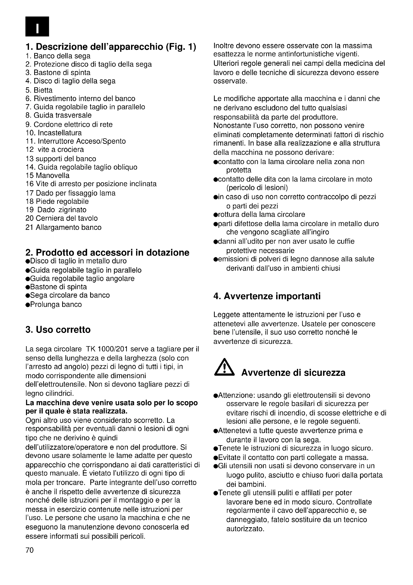 La sega circolare TK 1000/201 serve a tagliare per il senso della lunghezza e della larghezza (solo con l’arresto ad angolo) pezzi di legno di tutti i tipi, in modo corrispondente alle dimensioni dell’elettroutensile. Non si devono tagliare pezzi di legno cilindrici. La macchina deve venire usata solo per lo scopo per il quale è stata realizzata. Ogni altro uso viene considerato scorretto. La responsabilità per eventuali danni o lesioni di ogni tipo che ne derivino è quindi dell’utilizzatore/operatore e non del produttore. Si devono usare solamente le lame adatte per questo apparecchio che corrispondano ai dati caratteristici di questo manuale. È vietato l’utilizzo di ogni tipo di mola per troncare. Parte integrante dell’uso corretto è anche il rispetto delle avvertenze di sicurezza nonché delle istruzioni per il montaggio e per la messa in esercizio contenute nelle istruzioni per l’uso. Le persone che usano la macchina e che ne eseguono la manutenzione devono conoscerla ed essere informati sui possibili pericoli. Inoltre devono essere osservate con la massima esattezza le norme antinfortunistiche vigenti. Ulteriori regole generali nei campi della medicina del lavoro e delle tecniche di sicurezza devono essere osservate. Le modifiche apportate alla macchina e i danni che ne derivano escludono del tutto qualsiasi responsabilità da parte del produttore. Nonostante l’uso corretto, non possono venire eliminati completamente determinati fattori di rischio rimanenti. In base alla realizzazione e alla struttura della macchina ne possono derivare: contatto con la lama circolare nella zona non protetta contatto delle dita con la lama circolare in moto (pericolo di lesioni) in caso di uso non corretto contraccolpo di pezzi o parti dei pezzi rottura della lama circolare parti difettose della lama circolare in metallo duro che vengono scagliate all’ingiro danni all’udito per non aver usato le cuffie protettive necessarie emissioni di polveri di legno dannose alla salute derivanti dall’uso in ambienti chiusi