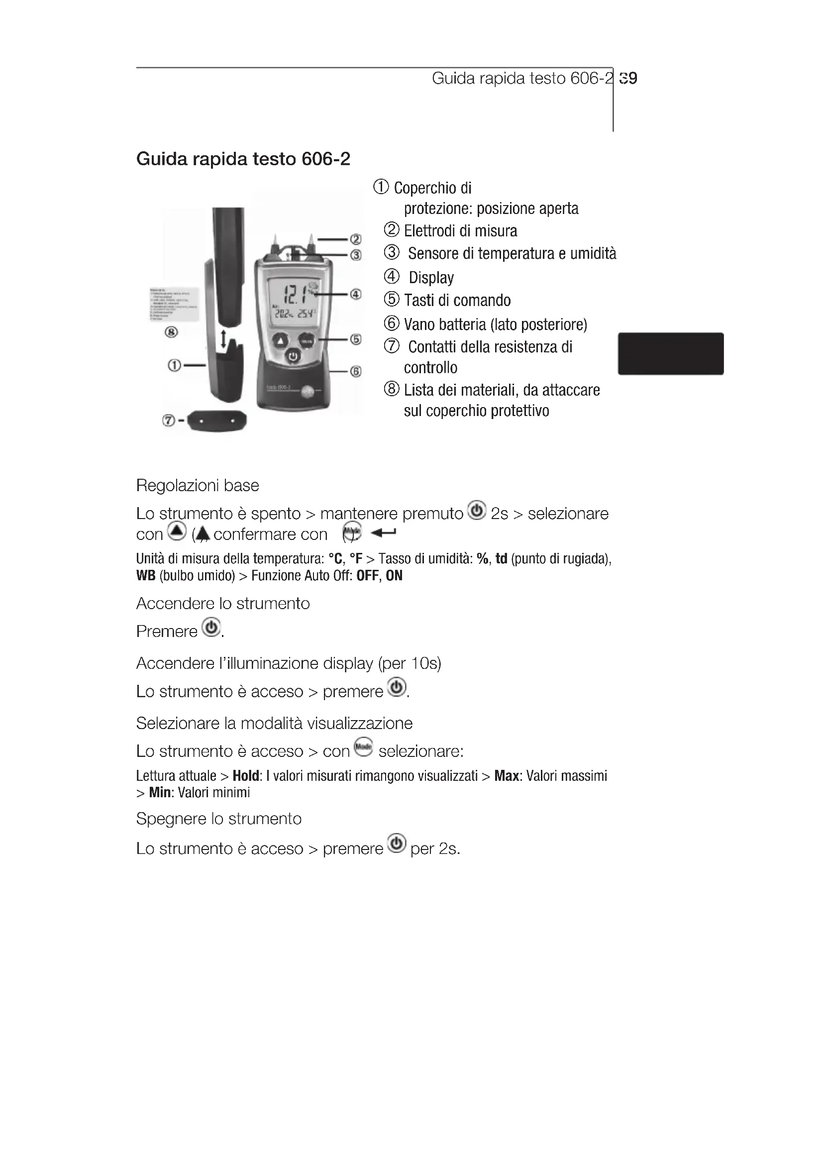 Selezionare la modalità visualizzazione Lo strumento è acceso > con selezionare: Lettura attuale > Hold: I valori misurati rimangono visualizzati > Max: Valori massimi > Min: Valori minimi Spegnere lo strumento Lo strumento è acceso > premere per 2s. deenfresitptsvnl????Sicurezza e ambiente40 Sicurezza e ambiente In questo manuale > Leggere attentamente il presente manuale per acquisire familiarità con lo strumento prima della messa in funzione. Conservare il manuale a portata di mano per consultarlo in caso di necessità. Consegnare il presente manuale al successivo utente dello strumento. > Osservare attentamente le informazioni accompagnate dai seguenti simboli: Con il simbolo Cautela!: si segnala un pericolo che può provocare lesioni o danni non gravi se non si osservano le precauzioni indicate. Note importanti. Evitare danni personali / e materiali > Utilizzare lo strumento solo per gli scopi previsti e conformemente ai parametri indicati nei dati tecnici. Non forzare lo strumento. > Non stoccare lo strumento insieme a solventi, soluzioni acide o altre sostanze aggressive. > Eseguire esclusivamente gli interventi di manutenzione e riparazione descritti nel manuale, rispettando le fasi di lavoro descritte. Utilizzare solo parti di ricambio originali Testo. Proteggere l‘ambiente > Smaltire le batterie ricaricabili difettose o le batterie esaurite negli appositi contenitori. > Rispedire lo strumento direttamente a Testo al termine della sua vita operativa. Testo provvederà a smaltirlo nel rispetto dell‘ambiente.Descrizione delle prestazioni 41 Descrizione delle prestazioni Funzioni e utilizzo Testo 606-2 è uno strumento di misurazione dell‘umidità dei materiali, dell‘umidità dell‘aria e della temperatura. Lo scopo di utilizzo più diffuso è il controllo del contenuto di umidità nel legno o nei materiali edili e dell’umidità dell‘aria. La procedurea di misura viene usata per controllare se è in atto un processo di essiccazione del materiale. L’umidità viene visualizzata in % di peso. Dati tecnici di misurazione deenfresitptsvnl???? Dati tecnici di misurazione