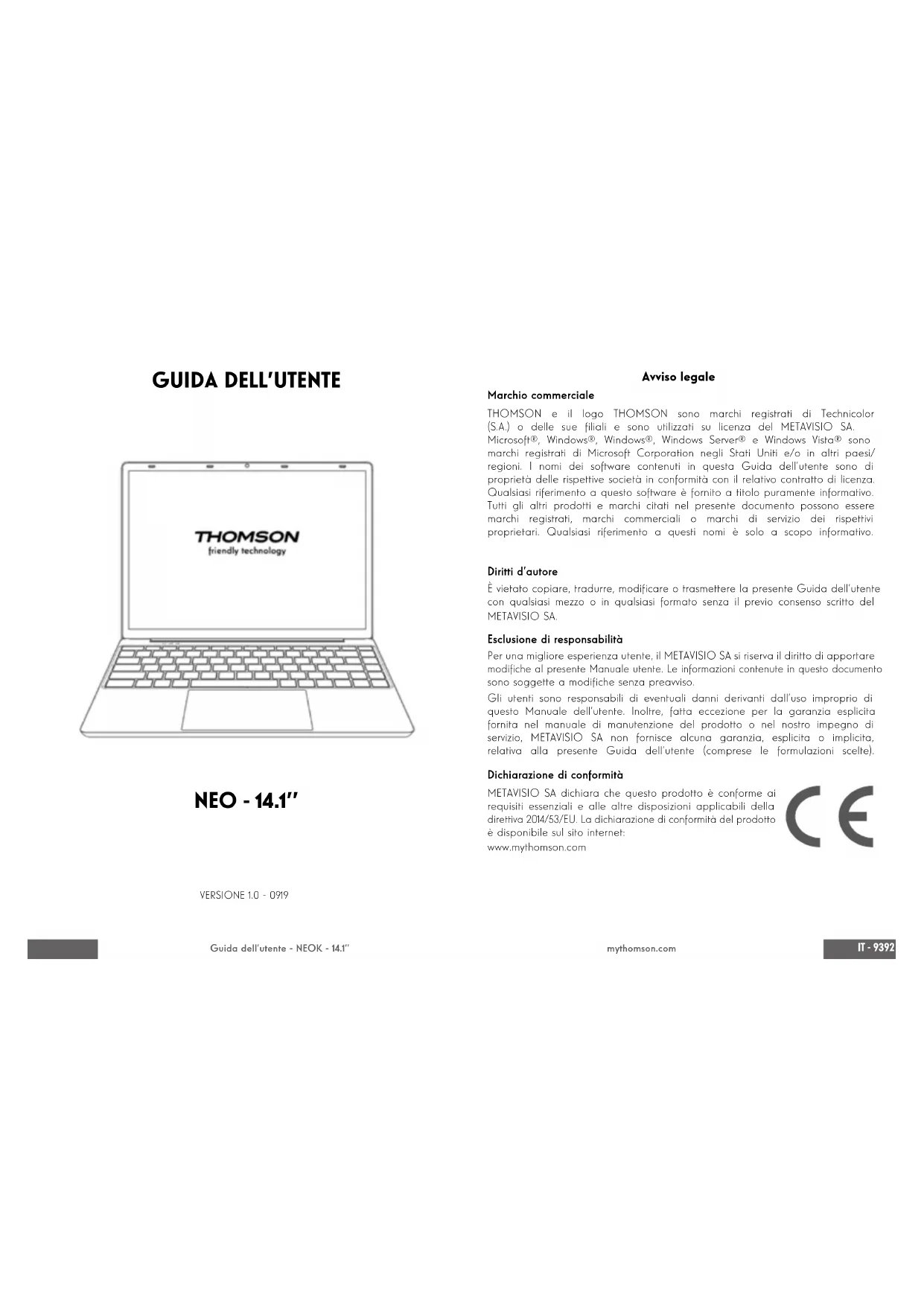 NEO - 14.1’’ VERSIONE 1.0 - 0919 Avviso legale Marchio commerciale THOMSON e il logo THOMSON sono marchi registrati di Technicolor (S.A.) o delle sue liali e sono utilizzati su licenza del METAVISIO SA. Microsoft®, Windows®, Windows®, Windows Server® e Windows Vista® sono marchi registrati di Microsoft Corporation negli Stati Uniti e/o in altri paesi/ regioni. I nomi dei software contenuti in questa Guida dell’utente sono di proprietà delle rispettive società in conformità con il relativo contratto di licenza. Qualsiasi riferimento a questo software è fornito a titolo puramente informativo. Tutti gli altri prodotti e marchi citati nel presente documento possono essere marchi registrati, marchi commerciali o marchi di servizio dei rispettivi proprietari. Qualsiasi riferimento a questi nomi è solo a scopo informativo. Diritti d’autore È vietato copiare, tradurre, modicare o trasmettere la presente Guida dell’utente con qualsiasi mezzo o in qualsiasi formato senza il previo consenso scritto del METAVISIO SA. Esclusione di responsabilità Per una migliore esperienza utente, il METAVISIO SA si riserva il diritto di apportare modiche al presente Manuale utente. Le informazioni contenute in questo documento sono soggette a modiche senza preavviso. Gli utenti sono responsabili di eventuali danni derivanti dall’uso improprio di questo Manuale dell’utente. Inoltre, fatta eccezione per la garanzia esplicita fornita nel manuale di manutenzione del prodotto o nel nostro impegno di servizio, METAVISIO SA non fornisce alcuna garanzia, esplicita o implicita, relativa alla presente Guida dell’utente (comprese le formulazioni scelte). Dichiarazione di conformità METAVISIO SA dichiara che questo prodotto è conforme ai requisiti essenziali e alle altre disposizioni applicabili della direttiva 2014/53/EU. La dichiarazione di conformità del prodotto è disponibile sul sito internet: www.mythomson.comIT - 9594 - IT Guida dell’utente - NEOK - 14.1’’ mythomson.com - Importanti indicazioni di sicurezza - Questa unità deve essere utilizzata in un ambiente con una temperatura ambiente compresa tra 5°C (41°F) e 35°C (95°F). Non esporre l’apparecchio alla pioggia o all’umidità e tenerlo lontano da liquidi. In caso di spruzzi d’acqua o altri liquidi sull’unità, spegnere immediatamente l’unità e attendere che sia completamente asciutta prima di riaccenderla. Non esporre l’apparecchio direttamente alla radiazione solare. Non utilizzare solventi forti, detergenti liquidi o altri prodotti chimici sulla supercie dell’unità o in prossimità di essa per evitare la corrosione o il deterioramento della supercie dell’unità. Non esporre la fotocamera a un ambiente polveroso. Non utilizzare l’unità durante una fuga di gas. Non esporre il dispositivo a forti campi magnetici o elettrici. È possibile far passare il dispositivo attraverso i rilevatori di raggi X dell’aeroporto. Tuttavia, si raccomanda di non far passare il dispositivo attraverso i portali di rilevamento magnetico e di non esporlo a rivelatori portatili. Non mettere niente, non disporre nessun oggetto sul dispositivo. Non appoggiare l’unità su una supercie irregolare o instabile. Assicurarsi di proteggere l’unità da cadute o qualsiasi altro impatto che possa danneggiarla. Non lasciare l’apparecchio acceso o caricato sulle ginocchia o su qualsiasi altra parte del corpo per evitare il rischio di lesioni dovute al calore. Spegnere l’apparecchio prima di trasportarlo o coprirlo con un materiale che non consente una circolazione ottimale dell’aria. Non utilizzare cavi di alimentazione, accessori o altri dispositivi danneggiati con l’apparecchio. Si raccomanda l’uso esclusivo degli accessori (alimentatore, cavi, ecc.) forniti con l’apparecchio. Utilizzare solo le batterie originali. La sostituzione della batteria con una batteria errata può causare un rischio di esplosione. Non smontare, modicare o riparare l’apparecchio da solo, in quanto ciò potrebbe invalidare la garanzia. Si prega di eseguire regolarmente il backup dei contenuti importanti per evitare la perdita di dati. La nostra azienda non si assume alcuna responsabilità per la perdita o la rimozione degli elementi contenuti nel dispositivo a causa di un uso improprio dell’hardware o del software, della mancanza di manutenzione o di qualsiasi altro evento accidentale. A pieno volume, l’ascolto prolungato del dispositivo audio portatile può danneggiare l’udito dell’utente. Questo prodotto è stato progettato per consentire un corretto riciclaggio di parti e componenti. Il simbolo di un bidone barrato indica che l’apparecchio non deve essere smaltito insieme ai riuti urbani. Consultare le normative locali per lo smaltimento dei dispositivi elettronici. Il simbolo di un bidone barrato indica che la batteria non deve essere smaltita insieme ai riuti urbani. Consultare le normative locali per lo smaltimento delle batterie.IT - 9796 - IT Guida dell’utente - NEOK - 14.1’’ mythomson.com Vista frontale - Presentazione del dispositivo -