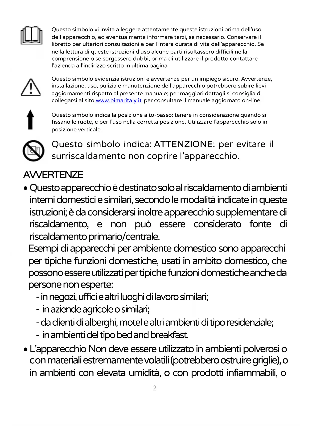 Questo simbolo vi invita a leggere attentamente queste istruzioni prima dell’uso dell’apparecchio, ed eventualmente informare terzi, se necessario. Conservare il libretto per ulteriori consultazioni e per l’intera durata di vita dell’apparecchio. Se nella lettura di queste istruzioni d’uso alcune parti risultassero difficili nella comprensione o se sorgessero dubbi, prima di utilizzare il prodotto contattare l’azienda all’indirizzo scritto in ultima pagina. Questo simbolo evidenzia istruzioni e avvertenze per un impiego sicuro. Avvertenze, installazione, uso, pulizia e manutenzione dell’apparecchio potrebbero subire lievi aggiornamenti rispetto al presente manuale; per maggiori dettagli si consiglia di collegarsi al sito www.bimaritaly.it, per consultare il manuale aggiornato on-line. Questo simbolo indica la posizione alto-basso: tenere in considerazione quando si fissano le ruote, e per l’uso nella corretta posizione. Utilizzare l’apparecchio solo in posizione verticale. Questo simbolo indica: ATTENZIONE: per evitare il surriscaldamento non coprire l’apparecchio. AVVERTENZE