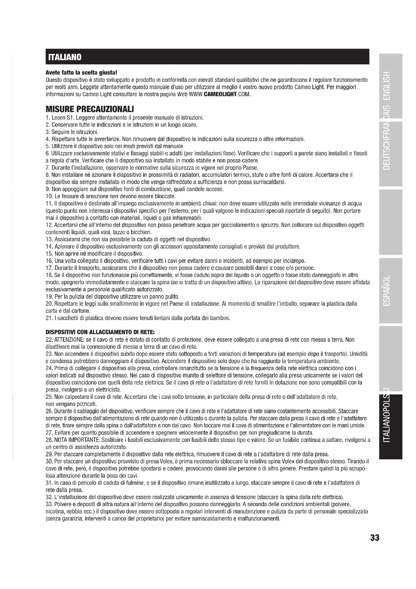 38. Se il cavo di alimentazione del dispositivo è danneggiato, quest‘ultimo non deve essere utilizzato. Il cavo di alimentazione deve essere sostituito con un cavo appropriato o un‘unità speciale da un centro di assistenza autorizzato. ATTENZIONE: non togliere mai il coperchio di protezione perché sussiste il pericolo di scosse elettriche. L‘inter- no del dispositivo non contiene parti che possono essere riparate o sottoposte a manutenzione da parte dell‘utente. Per gli interventi di manutenzione e di riparazione rivolgersi esclusivamente a personale qualificato. Il triangolo equilatero con il simbolo del lampo segnala la presenza di tensioni pericolose non isolate all‘interno dell‘apparec- chio che possono causare scosse elettriche. Il triangolo equilatero con punto esclamativo segnala la presenza di importanti informazioni relative all’uso e alla manutenzione. Avvertimento! Questo simbolo indica superfici calde. Alcune parti della cassa potrebbero scaldarsi durante l‘impiego. Dopo aver usato l‘apparecchiatura, lasciarla raffreddare per almeno 10 minuti prima di toccarla o trasportarla. Avvertimento! Questo dispositivo è destinato per l’utilizzo a un’altitudine non superiore ai 2.000metri sul livello del mare. Avvertimento! Questo dispositivo non è destinato all’uso nei climi tropicali. CAUTELA! INFORMAZIONI IMPORTANTI SULLE MACCHINE DEL FUMO! 1° Il prodotto è stato progettato per l’uso professionale nell’ambito della tecnologia per eventi e non è adatto per l’uso domes- tico! 2° Utilizzare esclusivamente il liquido per effetto nebbia Cameo (a base d’acqua) e non versare mai liquidi infiammabili nella tanica! Pericolo di esplosione! 3° Staccare la macchina del fumo dalla rete prima di sostituire la tanica o di rabboccare il fluido! 4° Utilizzare la macchina del fumo soltanto in ambienti ben arieggiati! 5° Sorvegliare sempre il funzionamento della macchina del fumo! 6° Scollegare la macchina del fumo dalla rete prima della messa in opera e del montaggio e assicurarsi che la macchina del fumo si sia completamente raffreddata. 7° Durante l’uso l’ugello di uscita della nebbia raggiunge temperature molto elevate. Non toccare mai l’ugello di uscita durante l’uso e mantenere una distanza minima di 50 cm! Prima di effettuare le operazioni di pulizia e del trasporto assicurarsi che il dispositivo si sia completamente raffreddato! 8° La nebbia in uscita è molto calda! Non orientare mai l’ugello di uscita verso persone e animali! PERICOLO DI USTIONI! 9° Controllare che persone e animali non possano mai stazionare direttamente sotto alle macchine del fumo! PERICOLO DI USTIONI! 10” Non orientare mai l’ugello di uscita della nebbia verso fiamme libere e materiali infiammabili! 11° Assicurarsi che gli altri dispositivi elettrici e le prese elettriche non siano mai esposti al flusso diretto del fumo! 12° Davanti all’ugello di uscita del fumo, è possibile che durante il funzionamento si accumuli del fluido a seguito della con- densazione. Attenzione, pericolo di scivolamento! 13° Occasionalmente, durante il funzionamento, potrebbero fuoriuscire piccole quantità di fumo, anche se non è stato impartito il comando. Ciò può capitare anche poco dopo che la macchina del fumo è stata spenta. 14° Non esporre mai le persone affette da malattie respiratorie (ad es. soggetti allergici, asmatici) al fumo artificiale. 15° Quando si utilizzano macchine del fumo, assicurarsi che la visibilità nel locale non scenda al di sotto di ca. 2 metri, in modo che le persone nel locale possano comunque orientarsi in sicurezza. 16° Svuotare la tanica del liquido prima del trasporto. 17° La fuoriuscita del fumo può innescare i rilevatori antincendio. 18° Tenere lontano dalla portata dei bambini!35 DEUTSCHFRANCAIS ESPAÑOL ENGLISH ITALIANO POLSKI INTRODUZIONE
