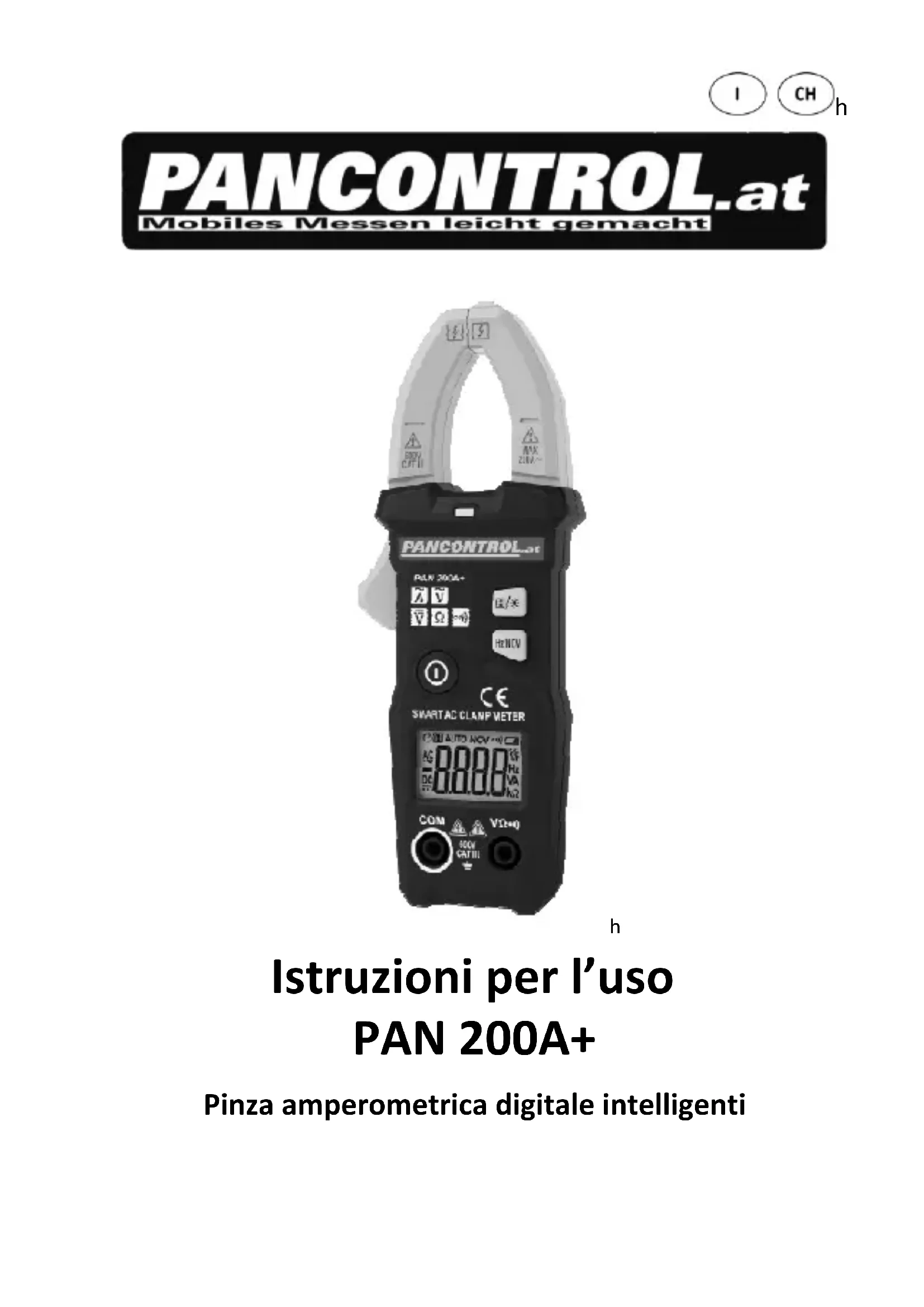 Grazie per aver acquistato un apparecchio PANCONTROL. Il marchio PANCONTROL è disponibile dal 1986 per strumenti di misura pratici, economici e professionali. Ci auguriamo che siate soddisfatti del vostro nuovo apparecchio e siamo convinti che vi fornirà ottime prestazioni per molti anni. Leggete per intero e attentamente le presenti istruzioni per l'uso prima di mettere in servizio per la prima volta l'apparecchio, al fine di prendere confidenza con un corretto uso dell’apparecchio e evitare malfunzionamenti. Seguite soprattutto tutte le avvertenze per la sicurezza. La mancata osservanza può causare danni all'apparecchio e danni alla salute. Conservate con cura le istruzioni per l'uso per consultarle in un momento successivo oppure per poterle consegnare insieme all'apparecchio.IT 3 Il PAN 200A+ è un intelligente pinza di misura corrente. Può rilevare automaticamente i segnali in entrata senza che l'utente debba selezionare una funzione di misurazione o un campo di misura. Funzioni: corrente alternata, tensione alternata, tensione di CC, frequenza, resistenza e prova di continuità Il progresso tecnico è soggetto a cambiamenti.
